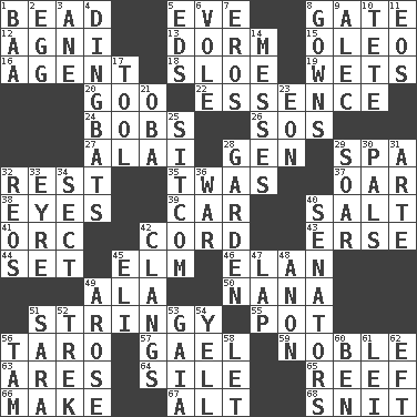 ACROSS 1. Necklace unit 5. First lady 8. Yard entry 12. Hindu god of fire 13. Dormintory (informal) 15. Margarine 16. Representative 18. _ gin 19. Soaks 20. Thick or sticky substance 22. Substance 24. Moves up and down 26. Distress signal 27. Jai ____ 28. Commissioned military rank (abbr.) 29. Health resort 32. Take ten 35. It was, poetically 37. Rowing implement 38. Sight organs 39. 4-wheeled motor vehicle 40. Table seasoning 41. The grampus (Milton) 42. Drawstring 43. Celtic language 44. Put into a specified state 45. Shade tree 46. Liveliness 49. Insect wing 50. Nanny 51. Slender, wiry 55. Plant holder 56. Pacific island yam 57. Highlander 59. Having high moral qualities 63. Ancient Greek god of war 64. Filth; sediment 65. Coral ridge 66. Create 67. Keyboard modifier key 68. In a ____ (agitated or irritated) DOWN 1. Sound made by sheep 2. Oval reproductive body of a fowl 3. A saturated hydrocarbon 4. Empty-headed or silly people 5. Begley and Asner 6. Short-tailed, large-bodied rat 7. Greek god of love 8. Long dresses 9. Actor Baldwin 10. Wig 11. Greek goddess of the dawn 14. Makes clutter 17. Utensil 21. Chief or king in Benin or Nigeria 23. A really long time 25. "Cheers" or "Ellen" 28. Place where plants grow 29. Fly high 30. Friends 31. Johnson of "Laugh-In" 32. Vintage cars 33. Jane of fiction 34. Religious group 36. Armed conflict 40. Elected representatives 42. Rings like a ship's bell 45. Biblical high priest 47. Pet locale 48. At once, immediately (arch.) 49. Came up 51. "Two Mules for Sister ____" 52. Long journey 53. Greek goddess of the earth (variant) 54. Shout 56. Scottish cap 58. Allow 60. Benjamin's nick name 61. Flowery wreath 62. Bank Draft (abbr.)