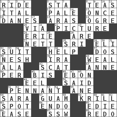ACROSS 1. Travel on or in a vehicle 5. R.R. building 8. Beverages made from leaves 12. Slanted text style (abbr.) 13. Diluted with white 15. At one time in the past 16. Natives or inhabitants of Denmark 18. Ancient river in northeast Turkey 19. Legendary monster 20. By way of 22. Photo 24. 4th largest of the Great Lakes 26. "We ___ not amused" (Victoria) 27. Remaining after all deductions 28. Indian title of respect (Mr.) 29. Biblical high priest 32. Set or collection 35. Aid 37. Two (Sp.) 38. Tender 39. Lyricist Gershwin 40. Welt 41. Chicken ___ king 42. Get outta here! 43. Queen of England 1702-14 44. For each 45. Altar cloth linen 46. Inky black, to poets 49. Snakelike fish 50. Alleged 51. Pre-World Series prize 55. One (Scot) 56. "Two Mules for Sister ____" 57. Island territory of the United States 59. Shrimp-like planktonic crustaceans 63. Specific locale 64. Inside; within (prefix) 65. Singer Brickell 66. Relaxation 67. Compass dir. 68. Make new DOWN 1. To free from 2. Call ___ day 3. One of the 12 tribes of Israel 4. Veterans Day date 5. Health resort 6. Canvas cover 7. Mountain range southwest of Kyrgyzstan 8. Woman's close-fitting hat 9. Engineer (abbr.) 10. 43,560 square feet 11. Observe 14. Fortification 17. The founder of a family 21. Small island 23. Three (prefix) 25. Value system 28. Chalkboards 29. Genesis locale 30. Grant temporary use of 31. Small island 32. Fastener 33. Ubangi River tributary 34. Austrian river, tributary to the Danube 36. Epoch 40. Nomad 42. Fodder prepared in a silo 45. Benjamin's nick name 47. Sound made by sheep 48. Pig sound 49. Maternal 51. Dad 52. Greek god of love 53. Religious women 54. Bits 56. Compass dir. 58. Cut the grass 60. Binary compound 61. Flaplike covering 62. Lion