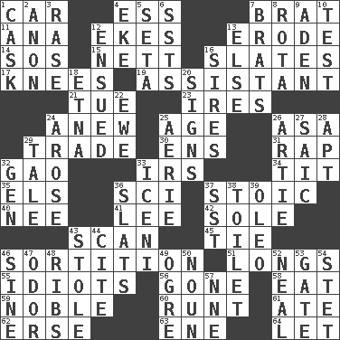 ACROSS 1. Auto 4. Double-curved letter 7. Naughty child 11. Santa ___, CA 12. Makes supply last 13. Eat (away) 14. Mayday 15. Remaining after all deductions 16. Chalkboards 17. Leg joints 19. Aide 21. Third day of the wk. 23. Angers 24. Afresh 25. Personal question 26. White ___ sheet 29. Exchange 30. Followers of ems 31. Reproach for some lapse or misdeed 32. E Mali city 33. Big collection agency 34. Teat (slang) 35. Raised railways 36. _-fi 37. Unemotional 40. Born 41. Area sheltered from the wind 42. Flatfish 43. Examine hastily 45. Make a knot 46. Making a chance decision by using lots 51. Yearns 55. Foolish or stupid persons 56. Went 58. Erode 59. Impressive in appearance 60. The smallest animal of a litter 61. Had dinner 62. Celtic language 63. Compass dir. 64. Allow DOWN 1. Keg 2. Soon (poet.) 3. Raze (variant) 4. Supplement with great effort 5. Bristle 6. Fast planes 7. Naughty children 8. Roll call or roster of names 9. Arabian gulf 10. Trial 12. Took place subsequently 13. Otherwise 16. Founders of families 18. Inactive volcano in Sicily 20. Omens 22. She-sheep 24. Came up 25. Nest on high 26. Nick name for Arthur 27. Ketch in the Levant 28. Fitting 29. Falsehood 32. Commissioned mil. rank 33. Ancient Celtic tribe of eastern Britain 36. Narrow boards 37. Fast jet (abbr.) 38. Bathroom plumbing fixture 39. Margarine 43. Took without asking 44. Quote 46. Trig term 47. Scent 48. Chest bones 49. Legendary monster 50. Part of speech 52. Be tempered by heat 53. Yard entry 54. Proofreading order 57. Compass dir.