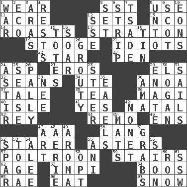 ACROSS 1. Erode 5. Fast jet (abbr.) 8. Purpose 11. 43,560 square feet 12. Arranges properly for use 13. Non-commissioned officer (abbr.) 14. Ridicules or criticizes harshly 17. Ski resort town in Vermont 19. Moe Howard, for one 21. Foolish or stupid persons 22. Play the lead 23. Fenced enclosure 24. Viper 27. Greek god of love 29. Raised railways 32. Seines 34. Shoshoni 36. Small Philippine buffalo 37. Story 38. Beverage made from leaves 39. Wise men 40. Capri or Wight 41. It is so 42. Relating to or accompanying birth 43. Marina Del _, California 44. San ____ (Riviera town) 46. Followers of ems 47. American Automobile Association (abbr.) 50. Long (Scottish) 52. A viewer who gazes fixedly 55. Michaelmas daisies 57. Characterized by complete cowardliness 59. Flight of steps 62. Personal question 63. Body of Kaffir warriors 64. Expressions of contempt or scorn 65. Actress Charlotte 66. Consume 67. Overwhelm DOWN 1. Armed conflict 2. Environmental prefix 3. Caspian sea tributary 4. Musical pauses 5. Put into a specified state 6. Remove all contents or possession from 7. Sadhe (variant) 8. To (old English) 9. Highlander 10. Immeasurably long periods of time 12. Compass dir. 15. Hauls 16. Fly high 18. Shallow baking pan 20. Cross 24. Moving about 25. Gospel singer Marvin 26. Chummy 28. Bull 29. Maternal 30. Utah city north of Ogden 31. Travel by water 33. Born 35. Artist's stands 36. Wet nurse (var.) 42. Music written for nine 45. Floor coverings 47. Nonscientific branch of learning 48. Nest on high 49. Scent 51. Takes hold of 52. Practice fight 53. Ancient Roman robe 54. Toward shelter 55. Cuckoo 56. The Jewish people; Israel 58. Choose 60. Friend of Pooh 61. Compass dir.