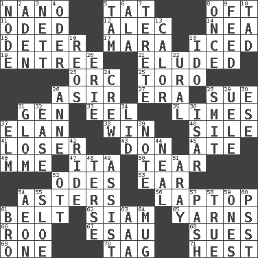ACROSS 1. Billionth: prefix 5. Make lace 8. Often (poetically) 11. Wrote a lyric poem 12. Actor Baldwin 14. Teachers' org. 15. Prevent from occurring 17. Hindu Mythology: god of death 18. On the rocks 19. Main course 21. Dodged 23. The grampus (Milton) 25. "Corrida" creature 26. SW Saudi Arabia district 27. Period 28. Institute legal proceedings 31. Commissioned mil. rank 33. Snakelike fish 35. Citrus fruits 37. Flair 38. Victory 40. Drop; flow; fall 41. Failure 43. Spanish title 45. Had dinner 46. Madame (abbr.) 47. Call ___ day 50. Pull apart 52. Lyric poems 53. Hearing organ 54. Michaelmas daisies 56. Portable computer 61. Waist strap 62. Thailand, formerly 65. Entertaining tales 66. Friend of Pooh 67. He sold his birthright 68. Institutes legal proceedings 69. Single 70. Label 71. Behest DOWN 1. Thickened enlargement 2. An important port of Yemen 3. Remaining after all deductions 4. River in Europe 5. Scottish cap 6. In the manner of 7. Cylindrical with tapered ends 8. At one time in the past 9. Nourish 10. Small amount or degree 13. Bodily heat indicating an inflammation 16. Vintage cars 18. Wedding promise 20. 4th largest of the Great Lakes 22. Mountain range 24. Group working together 26. Queen of England 1702-14 28. Stricken, poetically 29. Ubangi River tributary 30. Compass dir. 31. Seize upon or latch onto something 32. Comfort 34. Flaplike covering 36. Austrian river, tributary to the Danube 37. Shade tree 39. Observe 42. Travel on or in a vehicle 44. Anneal 48. Laconic 49. Help 51. Like ___ of sunshine 52. Baseball player Mel 54. Age 55. _ gin 57. Romantic infatuation 58. Loyal 59. Washington bills 60. Inconspicuous attention getter 61. Sis' sibling 63. Auto club (abbr.) 64. Java container