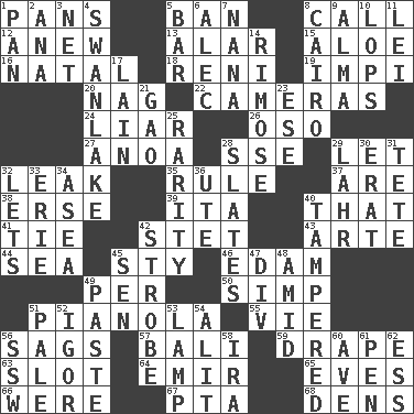 ACROSS 1. Zero-star reviews 5. Bar 8. Give a ring to 12. Afresh 13. Having or resembling wings 15. _ vera 16. Brizilian seaport 18. Painter Guido (1575-1642) 19. Body of Kaffir warriors 20. Tired old horse 22. Devices for capturing images 24. One who doesn't tell the truth 26. Bear (Spanish) 27. Small Philippine buffalo 28. Compass dir. 29. Allow 32. Path through which fluid escapes 35. Governing power 37. "We ___ not amused" (Victoria) 38. Celtic language 39. Call ___ day 40. Not this but _ 41. Neckwear 42. Proofreading order 43. Johnson of "Laugh-In" 44. Ocean 45. Filthy place 46. Dutch treat 49. For each 50. Simple or foolish person 51. Player piano 55. Compete 56. Droops 57. Indonesian resort city 59. Window treatment 63. Position in a hierarchy or organization 64. Arab leader 65. Nights before holidays 66. Past tense of be (plural) 67. Parent Teacher Association (abbr.) 68. Hiding places for outlaws DOWN 1. Baking dish 2. Santa ___, CA 3. Fish or hair follower 4. Tchaikovsky ballet 5. Soap unit 6. Actor Baldwin 7. Nanny 8. Capital of Egypt 9. _ mater 10. Chops off 11. Luau accessory 14. Full of chinks, cracks, or crevices 17. (Had) reclined 21. E Mali city 23. Compass dir. 25. Noteworthy scarcity 28. Chalkboards 29. Cowardly lion portrayer 30. Part of Q.E.F. 31. False hair 32. Allows 33. One of the Great Lakes 34. Toward the sea 36. Shoshoni 40. ________ with (broke a safety seal) 42. Disco prop 45. Elected rep. 47. HTML Container Element 48. Among 49. Thick mixture 51. Light colored 52. Composer Stravinsky 53. Desk light 54. Set down 56. Compass dir. 58. Retirement account (abbr.) 60. "___ Maria" 61. Animal enclosure 62. Curvy letter
