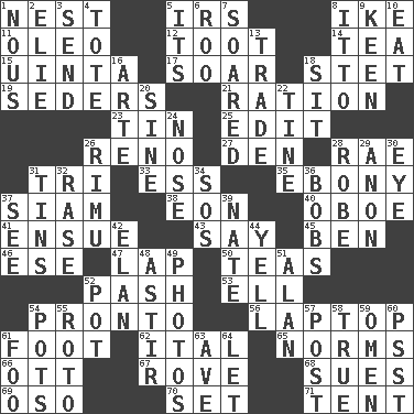ACROSS 1. A home for chicks 5. Big collection agency 8. Mamie's mate 11. Margarine 12. A blast of a horn 14. Beverage made from leaves 15. National forest in Provo, Utah 17. Fly high 18. Proofreading order 19. Spring feasts 21. Food allowance for one day 23. Shallow baking pan 25. Prepare for publication 26. Western Nevada city 27. Lair 28. Actress Charlotte 31. Three (prefix) 33. Curvy letter 35. Black 37. Thailand, formerly 38. A really long time 40. Mitch Miller's instrument 41. Take place subsequently 43. Declare 45. Benjamin's nick name 46. Compass dir. 47. Infant locale 50. Beverages made from leaves 52. Romantic infatuation 53. Pipe bend 54. Right away 56. Portable computer 61. Pick up the tab 62. Slanted text style (abbr.) 65. Typical models 66. Baseball player Mel 67. Be footloose 68. Institutes legal proceedings 69. Bear (Spanish) 70. Arrange properly for use 71. Portable shelter DOWN 1. Good sense 2. Writer Wiesel 3. Transmit 4. Carry 5. It is 6. Friend of Pooh 7. Flew 8. "Tell ____ the Marines!" 9. Peachy ____! 10. Ingest 13. Buy and sell 16. Johnson of "Laugh-In" 18. Be seated 20. Trig term 22. Prong on a fork 24. Olfactory organ 26. Tall New Zealand timber tree 28. Loose flowing garment 29. At once, immediately (arch.) 30. Sight organ 31. Airtight sealed metal containers 32. Raze (variant) 34. Mayday 36. Moves up and down 37. Observe 39. Nathan's nickname 42. Flair 44. Shout 48. Having gotten out of bed 49. Pictures 51. ____ Jay Lerner 52. Plant holder 54. Cooking vessels 55. Printing process, for short 57. Mail 58. Loyal 59. Sign of things to come 60. Inconspicuous attention getter 61. Egg _ yung 63. "___ Maria" 64. Allow