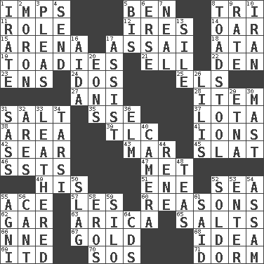 ACROSS 1. Naughty children 5. Benjamin's nick name 8. Three (prefix) 11. Hero or heavy, e.g. 12. Angers 14. Boat paddle 15. Sports stadium 17. Slender Brazilian palm 18. "One Day ___ Time" 19. Sycophants 21. Pipe bend 22. Lair 23. Followers of ems 24. Two (Sp.) 25. Raised railways 27. Cuckoo 28. Detail 31. Table seasoning 35. Compass dir. 37. Globular water bottle used in Asia 38. Length times width 39. Affectionate concern, for short 41. Charged particles 42. Shrivel 43. Impair 45. Narrow board 46. Fast planes 47. Was introduced to 49. Part of HMS, perhaps 51. Compass dir. 52. Ocean 55. Adept person 57. French article 60. Thinks logically 62. Slender fish 63. N. Chile seaport 65. Table seasonings 66. Compass dir. 67. Precious metal 68. The content of cognition 69. It would 70. Mayday 71. Dormintory (informal) DOWN 1. Feeling or showing extreme anger 2. Person of subnormal intelligence 3. Entreaties 4. Post 5. Twice 6. Celtic language 7. Be tempered by heat 8. Inedible or poisonous agaric 9. Assign a rank or rating to 10. SW Asia republic 13. Filth; sediment 16. Opera by Verdi 17. Help 20. Immeasurably long periods of time 26. Ms. Damita and namesakes 29. Inactive volcano in Sicily 30. Vertical spar for supporting sails 31. Backtalk 32. Ancient Greek god of war 33. Resembling or made to resemble leather 34. Tarsus (plural) 36. Shade tree 40. Device for capturing images 44. French philosopher Descartes 48. Afternoon social gatherings 50. Volcanic refuse 52. Twentieth part of a lira 53. Keyboard key 54. Indian state 55. Hindu god of fire 56. Patter 58. Greek god of love 59. Grain storage tower 61. Expressed in words 64. Music discs