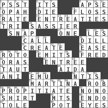 ACROSS 1. Inconspicuous attention getter 5. It is 8. Domed church section 12. Brightly colored fish 13. Expire 14. Soft thread for cleaning between teeth 15. Pace 16. Pleas 19. Three (prefix) 20. More impudent 21. Fastener 23. Single 24. French article 27. Give a ring to 30. Deli pickle 31. Make 34. Comfort 35. Printing process, for short 38. Sends forth 40. Flintstone 41. Mouths or openings 42. Main course 44. Drawn tight 45. Opera by Verdi 46. Black tropical American cuckoo 47. Australian flightless bird 50. Nuclear Threat Initiatives 53. Chrissie's court nemesis 57. Director Reiner 59. Conciliate 63. Words to Nanette 64. Chest covering 65. Mountains (abbr.) 66. Inside; within (prefix) 67. Lacquered or enameled metalware 68. Cooking vessel 69. Sight organs DOWN 1. Sweet dark-red dessert wine 2. Practice fights 3. Smooth fabric 4. Definite Article 5. It may be bright or harebrained 6. Metal containers 7. Puts into a specified state 8. Keyboard modifier key 9. Luau course 10. Compass dir. 11. Curvy letter 14. Conductor's collection 17. River (Sp.) 18. Car or cant ending 20. Practice fight 22. Buttonhole 24. One who doesn't tell the truth 25. Otherwise 26. Downhill vehicle 28. Area sheltered from the wind 29. Unable to walk 30. Outscore 32. Shallow baking pan 33. Singer James 35. Round or rotation of duties 36. NW Algerian seaport 37. "Change" in Tahitian 39. Indian title of respect (Mr.) 43. Pulitzer Prize-winning author Ferber 47. Give off 48. Floor protector 49. RI univ. 51. Literary sarcasm 52. Message 54. Pack (down) 55. "Tell ____ the Marines!" 56. A home for chicks 58. Expressions of contempt or scorn 59. Pacific Standard Time (abbr.) 60. 17th letter of the Greek alphabet 61. Petroleum 62. Before (prefix) 63. Born