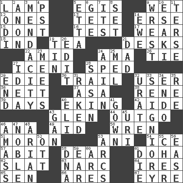 ACROSS 1. Desk light 5. Armor plate that protects the chest 9. Dripping 12. Washington bills 13. Wig 14. Celtic language 15. Do not 16. Trial 17. Put on (as clothing) 18. Indiana (abbr.) 19. Afternoon social gathering 21. Writing tables 22. Among 24. Nanny (var.) 26. Make a knot 27. Ancient Celtic tribe of eastern Britain 28. Broke a traffic law 29. Singer Brickell 30. Go after with the intent to catch 32. One who uses or employs something 36. Remaining after all deductions 37. White ___ sheet 38. French philosopher Descartes 39. 24-hour periods 40. Supplementing with great effort 42. Helper 43. Small, secluded valley 44. Expenditure 46. Santa ___, CA 49. Assist 50. Songbird 51. Person of subnormal intelligence 53. Cuckoo 54. Frozen water 57. "This won't hurt ____!" 58. Letter starter 61. Capital of the state of Qatar 62. Narrow board 63. Drug cop 64. Angers 65. Elected rep. 66. Ancient Greek god of war 67. Jane of fiction DOWN 1. Farming town in central California 2. Soon (poet.) 3. Ananias' fault 4. Pacific Standard Time (abbr.) 5. Singer James 6. Unit of force equal to gravity 7. It is 8. Put into a specified state 9. Take or capture by force 10. 1973 Nobel Price Winner (Physics) Leo 11. Laconic 14. She-sheep 19. Shallow baking pan 20. Prepare for publication 21. Male parent 23. Confronts 24. Bee-related 25. Cartoonist voice _ Blanc 27. It may be bright or harebrained 28. Indian antelope 29. Conclusion 31. Swept the length of 32. A salt of uric acid 33. Signiory (variant) 34. Inside; within (prefix) 35. Portuguese money of account (variant) 40. Connecticut Ivy Leaguer 41. Bride's dress 43. Separate the seeds from cotton 45. RI univ. 46. Collect or gather 47. Impressive in appearance 48. Believer in; advocate of (suffix) 52. Baseball player Mel 53. Arches 55. "Mermaids" star 56. Comfort 58. Heredity factor (abbr.) 59. Hearing organ 60. "We ___ not amused" (Victoria) 61. Pass on