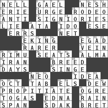 ACROSS 1. 1994 drama film starring Jodie Foster 5. Highlander 9. Delicate 13. 4th largest of the Great Lakes 14. Goad 15. Cowboy competition 16. Against 17. Seigniories (variant) 19. Whopper 20. _ moment's notice (2 wds.) 21. Wedding promise 22. Compass dir. 23. Blunders 25. Fish or hair follower 26. Supplementing with great effort 30. Mild oath 34. More uncommon 35. Distinctive style or manner 36. Tall New Zealand timber tree 39. Theater features 42. _ mater 43. SW Asia republic 44. A special lineage 46. 24-hour periods 47. Burn superficially 48. Modern: prefix 51. The main thing one is thinking about 54. Sep. follower 57. Keyboard key 58. Raised railways 60. Morning condensation 62. Conciliate 65. Legendary monster 66. Ancient Roman robes 67. Pulitzer Prize-winning author Ferber 68. Precipitation 69. Connect, as a bridge 70. Neighbor of Neb. 71. Cy Young winner Saberhagen DOWN 1. Anneal 2. Bert's buddy 3. 61 cubic inches 4. Flowery wreath 5. Abrupt rush of wind 6. Operatic vocal solo 7. Oval reproductive body of a fowl 8. Soviet premier 1918-24 9. Or not 10. Singer Brickell 11. Perceives with the eye 12. Flexible conduit 15. Carrot, for example 18. Binary compound 20. "____ silly question..." 24. Summer TV shows 27. Big collection agency 28. Born 29. Catches 30. Eluded 31. Set 32. Direct toward a target or goal 33. Heredity factor (abbr.) 36. To free from 37. Lyricist Gershwin 38. Fifth month 40. Three (prefix) 41. Elected rep. 45. Armor plate that protects the chest 48. Nuclear Threat Initiatives 49. Erode 50. Off-Broadway awards 52. _ Allan Poe 53. Nest on high 54. Chooses 55. Riding implement 56. Ancient Roman robe 58. Inactive volcano in Sicily 59. Path through which fluid escapes 61. Left 63. Baking dish 64. Increase 65. Globe