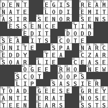 ACROSS 1. Incision 5. Armor plate that protects the chest 9. 480, 500 or 516 sheets of paper 13. Nathan's nickname 14. Farming town in central California 15. Give off 16. SW Saudi Arabia district 17. Sir (Sp.) 18. Elected reps. 19. Center 21. Metal container 22. Prepare for publication 23. Texas town _ City 24. Ocean 27. ___ a Wonderful Life 28. ____ d'Azur (French Riviera) 29. Join together 31. Health resort 32. Drug cop 36. Whirlpool 37. Afternoon social gathering 38. Russian ruler of old 39. Fly high 40. Whopper 41. Stop 42. Double curve, resembling the letter S 44. 17th letter of the Greek alphabet 46. ___ Haven, CT 47. Highlander 48. I made a mistake 50. Mouth edge 51. More impudent 54. Frog relative 56. Honkers 58. Jennifer or Joel 60. Against 61. Part of Q.E.F. 62. Sense of smell 63. Adolescent 64. Hearing organs 65. Fast planes DOWN 1. Heredity factor (abbr.) 2. Relaxation 3. Nuclear Threat Initiatives 4. Laconic 5. Chooses 6. Went 7. Wedding promise 8. Title for a knight 9. Home 10. Make improvements or corrections to 11. The 18th letter of the Arabic alphabet 12. Mountains (abbr.) 17. In a ____ (agitated or irritated) 20. Singer Brickell 21. Small child 23. ___ good deed 24. Takes to court 25. Inside; within (prefix) 26. Opera by Verdi 28. Accounting whiz (abbr.) 30. Polypeptide antibiotic 31. Observe 33. Muslim summons to prayer 34. To erase 35. Ship's personnel 37. Neckwear 40. Allow 41. 911 reaches them 43. Grand Old Party 44. Ridicules or criticizes harshly 45. Flexible conduit 47. Schedule 49. Public displays of written messages 51. Burn superficially 52. Greek god of love 53. Take ten 54. Make lace 55. Single 56. Unit of force equal to gravity 57. Epoch 59. Affirmative reply