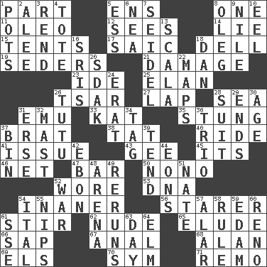 ACROSS 1. Piece 5. Followers of ems 8. Single 11. Margarine 12. Observes 14. Whopper 15. Portable shelters 17. Ketch in the Levant 18. Small valley 19. Spring feasts 21. Break 23. Binary compound 25. Liveliness 26. Russian ruler of old 27. Infant locale 28. Ocean 31. Australian flightless bird 33. Krazy ___ of comics 35. Feeling sharp psychological pain 37. Naughty child 38. Make lace 40. Travel on an animal 41. Come out of 43. Unit of force equal to gravity 45. ___ a Wonderful Life 46. Fish or hair follower 47. Drinking establishment 50. Words to Nanette 52. Had on 53. Heredity factor (abbr.) 54. More empty; more void 56. A viewer who gazes fixedly 61. Use a swizzle stick 62. Unadorned 65. Evade 66. Plant excrement 67. Of or related to the anus 68. ____ Jay Lerner 69. Raised railways 70. Symbol (abbr.) 71. San ____ (Riviera town) DOWN 1. Plant holders 2. Toward shelter 3. Tear apart 4. Carryall 5. Double-curved letter 6. Teachers' org. 7. A glass for beer 8. Cassini of fashion 9. The longest river in the world 10. Snakelike fish 13. Any of the three canals of the cochlea 16. Indian titles of respect 18. Daniel's nick name 20. Neighbor of Neb. 22. Atlas contents 24. Part of Q.E.F. 26. Ballerina skirt 28. Set of matching outer garments 29. Conclusions 30. Mature 31. Celtic language 32. Vertical spar for supporting sails 34. Label 36. Musical group of three 37. Storage container 39. Watch over 42. Inky black, to poets 44. Immeasurably long periods of time 48. Sports stadium 49. Summer TV shows 51. Nathan's nickname 52. Armed conflict 54. Slanted text style (abbr.) 55. Pinches, bites 57. Having or resembling wings 58. Governing power 59. Dutch treat 60. Western Nevada city 61. Compass dir. 63. 24 hours 64. Shade tree