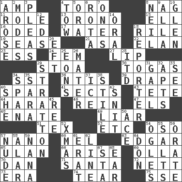 ACROSS 1. Electrical Unit 4. "Corrida" creature 8. Tired old horse 11. Hero or heavy, e.g. 13. U. of Maine site 15. Pipe bend 16. Wrote a lyric poem 17. Wetness 18. Cause heat under the collar 19. Gospel singer Marvin 21. White ___ sheet 22. Flair 23. Double-curved letter 24. Opposite of masc. 27. Mouth edge 29. Portico 30. Ancient Roman robes 34. Fast jet (abbr.) 36. Nuclear Threat Initiatives 39. Window treatment 40. Coast Guard woman 41. Religious groups 43. Wig 44. Ethiopian city, capital of Harari 46. It's straight from the horse's mouth 47. Raised railways 48. Related on the mother's side 49. One who doesn't tell the truth 51. John Ritter's dad 53. And so on (abbr.) 54. Bear (Spanish) 57. Billionth: prefix 60. Cartoonist voice _ Blanc 63. _ Allan Poe 65. ____ Bator 66. Get up 69. Water jar 70. Daniel's nick name 71. Before Barbara or Clara 72. Remaining after all deductions 73. Epoch 74. Lacerate 75. Compass dir. DOWN 1. Came up 2. Methods 3. Entreaties 4. Pull behind 5. Mouth or opening 6. Roll call or roster of names 7. Washington bills 8. Famous astronaut Armstrong 9. Silent film actress Nazimova 10. Small, secluded valley 12. Begley and Asner 14. Of the mouth 18. News announcer 20. Newt 25. Immeasurably long periods of time 26. Mother 28. It would 29. Ski resort town in Vermont 31. Highlander 32. Flats, for short 33. Observe 34. Connect, as a bridge 35. "Two Mules for Sister ____" 37. Frozen water 38. Vertical member of a panel or frame 40. A female animal or person 42. In a ____ (agitated or irritated) 45. Portuguese money of account (variant) 50. Adept person 52. Dec. holiday 54. Stares at amorously 55. Table seasonings 56. Speak pompously 57. Naked 58. Having or resembling wings 59. Grandmother 61. Part of Q.E.F. 62. Actor's bit 64. Spanish title 67. R.R. building 68. Ewer handle