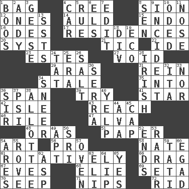 ACROSS 1. Container for groceries 4. Algonquian 8. The Jewish people; Israel 12. Washington bills 14. Old (Scot.) 15. Inside; within (prefix) 16. Lyric poems 17. Homes 20. System (abbr.) 21. Nervous spasm 22. Binary compound 23. _____ Park, CO 27. State of nonexistence 29. Ancient river in northeast Turkey 31. It's straight from the horse's mouth 34. Lacking originality or spontaneity 35. To the inside or interior of 36. Connect, as a bridge 39. Attempt 41. Play the lead 42. Capri or Wight 43. Arrive at 46. Cause heat under the collar 47. Inventor's middle name 48. Mouths or openings 51. Some stationery 54. Tate display 56. Adept person 58. Nathan's nickname 61. Producing rotation 66. To be drawn or hauled along 67. Nights before holidays 68. Writer Wiesel 69. Bristle 70. Ooze 71. Cuts off 72. To free from DOWN 1. Scornful sounds 2. "60 Minutes" Commentator Rooney 3. Honkers 4. Automobile 5. Regret 6. Raised railways 7. Prepare for publication 8. Elected rep. 9. Happening 10. Wrote a lyric poem 11. Olfactory organ 13. Fast planes 18. HTML Container Element 19. Environmental prefix 24. Make lace 25. Epoch 26. Table seasoning 28. From or relating to Ireland 30. Father Junipero _ 32. Call ___ day 33. And not 34. Contemptuous expression 36. Title for a knight 37. 23rd letter of the Greek alphabet 38. One to whom something is allotted 40. Sharp bark 44. Actress Gardner 45. Head covering 49. Fitting 50. _ Lanka 52. Extremities 53. More uncommon 54. Ancient Greek god of war 55. Be footloose 57. Baking chamber 59. Jacques of French films 60. Mild oath 62. Viper 63. Connecticut Ivy Leaguer 64. Mouth edge 65. Affirmative reply