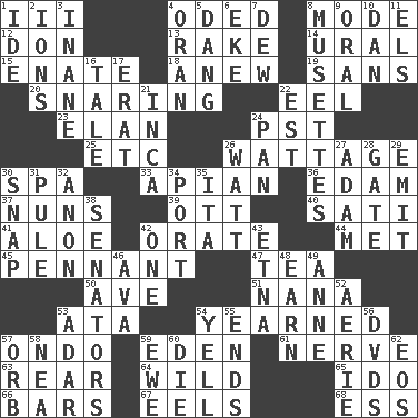 ACROSS 1. One more than two 4. Wrote a lyric poem 8. Method 12. Spanish title 13. Immoral or dissolute person 14. Mountain range 15. Maternal 18. Afresh 19. Without 20. Catching in a trap 22. Snakelike fish 23. Liveliness 24. Pacific Standard Time (abbr.) 25. And so on (abbr.) 26. Electrical Measurement 30. Health resort 33. Bee-related 36. Dutch treat 37. Religious women 39. Baseball player Mel 40. Suttee (variant) 41. _ vera 42. Speak pompously 44. Was introduced to 45. Pre-World Series prize 47. Afternoon social gathering 50. "___ Maria" 51. Nanny 53. "One Day ___ Time" 54. Had a strong desire 57. Southwest Nigerian state 59. Genesis locale 61. Boldness 63. Posterior 64. Uncontrolled 65. Wedding promise 66. Long, evenly shaped pieces 67. Snakelike fish 68. Curvy letter DOWN 1. Binary compound 2. Charged particles 3. Lacking in sense or substance 4. NW Algerian seaport 5. Mild oath, euphamism for damn 6. Make supply last 7. Morning condensation 8. French bagpipes 9. Taken by mouth 10. Daniel's nick name 11. Raised railways 16. Lie 17. Part of Q.E.F. 21. South American Indian 22. Eastern Standard Time (abbr.) 24. Baking dish 26. Electrical Unit 27. First of billions? 28. Yard entry 29. Give off 30. Fastener 31. Whine 32. At once, immediately (arch.) 34. Sweet dark-red dessert wine 35. Call ___ day 38. Elected representatives 42. Single 43. Inactive volcano in Sicily 46. Actress Gardner 48. Merit 49. Singer Murray 52. Nest on high 53. The sixth month of the Jewish calendar 54. Shout 55. Conclusions 56. Movie discs 57. Globe 58. Teachers' org. 59. She-sheep 60. Pass on 62. Greek goddess of the dawn