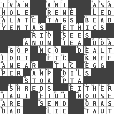 ACROSS 1. "Terrible" tsar 5. Cuckoo 8. White ___ sheet 11. Undercover agent 12. French philosopher Descartes 14. Directed 15. Having winglike extensions 17. Labels 18. Necklace unit 19. Gossips 21. Moral principles 23. River (Sp.) 25. Perceives with the eye 26. At once, immediately (arch.) 27. Beverage made from leaves 28. ___ good deed 31. Grand Old Party 33. Non-commissioned officer (abbr.) 35. Started a card game 37. Farming town in central California 38. And so on (abbr.) 40. Leg joint 41. Approach 43. Affectionate concern, for short 45. Oval reproductive body of a fowl 46. For each 47. Electrical Unit 50. Lubricates 52. Portico 53. Parent Teacher Association (abbr.) 54. Fragments 56. One or the other 61. "Change" in Tahitian 62. Needle case 65. Trap for birds or small mammals 66. "We ___ not amused" (Victoria) 67. Post 68. Mouths or openings 69. June honoree 70. Falsehood 71. Tense DOWN 1. "If ____ say so..." 2. Grand slam 3. ____ Jay Lerner 4. Remaining after all deductions 5. Nonscientific branch of learning 6. Teachers' org. 7. Consume 8. Actor Baldwin 9. Oceans 10. Say or write further 13. First name in cosmetics 16. Merit 18. Altar cloth linen 20. The Jewish people; Israel 22. Froth on beer 24. Single time 26. Capital of Western Samoa 28. Mild oath, euphamism for damn 29. Cassini of fashion 30. Had dinner 31. Went 32. Baltic tributary 34. Baseball player Mel 36. Makes supply last 37. Pet locale 39. Hoof sound 42. Pace 44. Quote 48. Methods 49. Soft color 51. (Had) reclined 52. Indian title of respect (Mr.) 54. "Two Mules for Sister ____" 55. Became colored 57. A blast of a horn 58. Israeli folk dance 59. Son of Isaac 60. Take ten 61. Small amount or degree 63. Single; one (prefix) 64. Binary compound