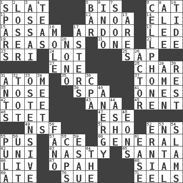 ACROSS 1. Narrow board 5. Again 8. Feline 11. Introduce or present, as a question 12. Small Philippine buffalo 14. Biblical high priest 15. Indian state 17. Zeal 18. Directed 19. Thinks logically 21. Single 22. Area sheltered from the wind 23. Indian title of respect (Mr.) 24. Car dealer's back yard 25. Plant excrement 27. Compass dir. 28. Burn to charcoal 31. Tiny particle 35. The grampus (Milton) 37. Heavy book 38. Olfactory organ 39. Health resort 41. Singles 42. Lug 43. Santa ___, CA 45. Monthly bill 46. Proofreading order 47. Compass dir. 49. Overdraft (abbr.) 51. 17th letter of the Greek alphabet 52. Followers of ems 55. Tenth month of the Hindu calendar 57. Adept person 60. Commissioned military rank 62. Single; one (prefix) 63. Difficult 65. Before Barbara or Clara 66. 54 in ancient Rome 67. Brightly colored fish 68. Thailand, formerly 69. Had dinner 70. Institute legal proceedings 71. Snakelike fish DOWN 1. Practice fights 2. Failure 3. Slender Brazilian palm 4. Beverages made from leaves 5. Tavern 6. Southeast Asian peninsula 7. Within a short period 8. Portable communications device 9. Toward shelter 10. Event that recurs at intervals 13. Ancient Greek god of war 16. Undercover agent 17. Michaelmas daisies 20. Words to Nanette 26. Thespian 29. So be it 30. State of inaction 31. Pismires 32. A blast of a horn 33. Clearly or manifestly demonstrative 34. Confronts 36. Accounting whiz (abbr.) 40. Disorder of the immune system 44. American tennis player Robert 48. Immeasurably long periods of time 50. Papal veil 52. Bert's buddy 53. Relating to or accompanying birth 54. Hits or strikes with great force 55. Monetary unit of Botswana 56. A single undivided whole 58. Balmoral and tarboosh 59. Son of Isaac 61. Comfort 64. Definite Article