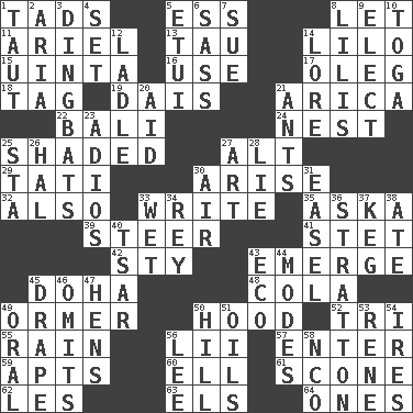ACROSS 1. Bits 5. Curvy letter 8. Allow 11. Satellite of Uranus 13. The 19th letter of the Greek alphabet 14. _ and Stitch 15. National forest in Provo, Utah 16. Purpose 17. Cassini of fashion 18. Label 19. Raised platform 21. N. Chile seaport 22. Indonesian resort city 24. A home for chicks 25. Cast a shadow over 27. The first octave above the treble staff 29. Jacques of French films 30. Originate 32. In addition 33. Compose 35. "____ silly question..." 39. Navigate 41. Proofreading order 42. Filthy place 43. Develop 45. Capital of the state of Qatar 48. Root beer relative 49. Abalone 50. Parka part 52. Three (prefix) 55. Water falling in drops from the sky 56. Cards in a Roman deck? 57. Keyboard key 59. Flats, for short 60. Pipe bend 61. Biscuitlike quick bread 62. French article 63. Raised railways 64. Washington bills DOWN 1. Tense 2. Operatic vocal solo 3. Empty-headed or silly people 4. Arrange properly for use 5. Needle holder 6. Backtalk 7. Take to court 8. Ms. Damita and namesakes 9. Opt 10. Ancient Roman robe 12. Dipping utensil 14. Old wives' tales, e.g. 20. Help 21. Pismires 23. Goodbye (Sp.) 25. R.R. building 26. Actor Linden 27. Tate display 28. Whopper 30. Wind 31. Artist's stand 33. Soggy 34. Marina Del _, California 36. Ski resort town in Vermont 37. Cask 38. Had dinner 40. Russian ruler of old 43. Environmental prefix 44. Methods 45. Window treatment 46. Leaves out 47. Coop moms 49. Taken by mouth 50. Land elevation 51. Petroleums 53. French philosopher Descartes 54. Angers 56. Area sheltered from the wind 58. Non-commissioned officer (abbr.)