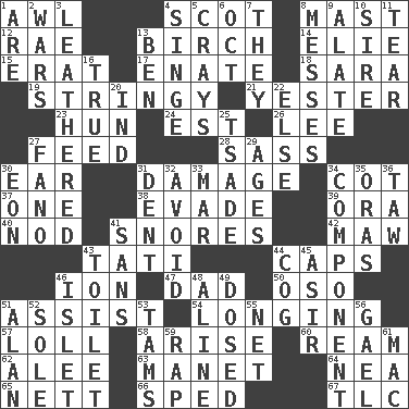 ACROSS 1. Leather borer 4. Highlander 8. Vertical spar for supporting sails 12. Actress Charlotte 13. A tree used for making furniture 14. Writer Wiesel 15. Part of Q.E.F. 17. Related on the mother's side 18. "Two Mules for Sister ____" 19. Slender, wiry 21. Last 23. Attila the _ 24. Eastern Standard Time (abbr.) 26. Area sheltered from the wind 27. Nourish 28. Backtalk 30. Hearing organ 31. Break 34. Small bed 37. Single 38. Dodge 39. Mouth or opening 40. Lower and raise head in agreement 41. Sounds asleep 42. Opening into something insatiable 43. Jacques of French films 44. Smile enhancers 46. Electrically charged atom 47. Male parent 50. Bear (Spanish) 51. Aid 54. Yearning 57. Hang loosely or laxly 58. Ascend 60. 480, 500 or 516 sheets of paper 62. Toward shelter 63. French painter Edouard 64. Teachers' org. 65. Remaining after all deductions 66. Drove too fast 67. Affectionate concern, for short DOWN 1. "We ___ not amused" (Victoria) 2. Armed conflicts 3. Resembling or made to resemble leather 4. Scorch 5. Trading vessels 6. Sep. follower 7. Those things 8. Makes clutter 9. Having winglike extensions 10. Male parent of an animal 11. Rend 13. Benjamin's nick name 16. Loyal 20. Working for oneself (abbr.) 22. Otherwise 25. Sadhe (variant) 27. Papal veil 29. Ripens 30. Age 31. Gouge 32. Keep away from 33. Impair 34. Part 35. Mouths or openings 36. The 23rd letter of the Hebrew alphabet 41. Without 43. Rest room 44. Gear tooth 45. SW Saudi Arabia district 46. Small island 48. Place in a line 49. Administered medicine 51. Actor Alda or Thicke 52. Flatfish 53. Scottish caps 55. Fish or hair follower 56. Highlander 59. Hit sharply and swiftly 61. Big _
