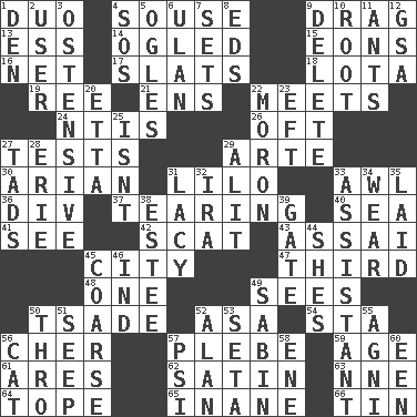 ACROSS 1. Superhero pair 4. Boozer 9. To draw with force 13. Curvy letter 14. Stared 15. Immeasurably long periods of time 16. Fish or hair follower 17. Narrow boards 18. Globular water bottle used in Asia 19. To sift 21. Followers of ems 22. Confronts 24. Nuclear Threat Initiatives 26. Often (poetically) 27. Trials 29. Johnson of "Laugh-In" 30. Believer in; advocate of (suffix) 31. _ and Stitch 33. Leather borer 36. HTML Container Element 37. Rending 40. Ocean 41. Perceive with the eye 42. Leave at once 43. Slender Brazilian palm 45. Municipality 47. One of three equal parts 48. Single 49. Observes 50. Sadhe (variant) 52. White ___ sheet 54. R.R. building 56. "Mermaids" star 57. Military trainee 59. Ripen 61. Ancient Greek god of war 62. Smooth fabric 63. Compass dir. 64. Drink excessively 65. Lacking in sense or substance 66. Shallow baking pan DOWN 1. Lair 2. One who makes use of a thing 3. Clearly or manifestly demonstrative 4. Mayday 5. Stares 6. ____ Bator, Mongolia 7. Puts into a specified state 8. Begley and Asner 9. Erase 10. Carrot, for example 11. Pismires 12. Girls' org. (abbr.) 20. Singer James 22. Person of subnormal intelligence 23. Newt 25. Is not 27. Small amounts or degrees 28. 4th largest of the Great Lakes 29. Set down 31. Made of lace 32. Retirement account (abbr.) 33. Aide 34. Put on (as clothing) 35. Put down 38. First name in cosmetics 39. Yard entry 44. "______ My Girl" (Turtles hit) 45. Rough 46. Working for oneself (abbr.) 49. Unit of acoustic absorption 50. Through, poetically 51. Ooze 52. Actor Alda or Thicke 53. Stalk of a moss capsule 55. Hindu god of fire 56. Domesticated feline 57. 23rd letter of the Greek alphabet 58. Compass dir. 60. Car or cant ending