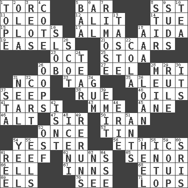 ACROSS 1. Torque (variant) 5. Long, evenly shaped piece 8. Fast jet (abbr.) 11. Margarine 12. Came down and settled, as after flight 14. Third day of the wk. 15. Secret plans 17. _ mater 18. Opera by Verdi 19. Artist's stands 21. Motion picture awards 23. Sep. follower 25. Portico 26. Mitch Miller's instrument 27. Snakelike fish 28. Medical imaging device (abbr.) 31. Non-commissioned officer (abbr.) 33. Label 35. Native American of Southwest Alaska 37. Ooze 38. Sorrow 40. Lubricates 41. Tarsus (plural) 43. Madame (abbr.) 45. One (Scot) 46. The first octave above the treble staff 47. Title for a knight 50. SW Asia republic 52. At one time in the past 53. Metal container 54. Of or pertaining to yesterday 56. Value system 61. Coral ridge 62. Religious women 65. Sir (Sp.) 66. Pipe bend 67. Taverns 68. Needle case 69. Raised railways 70. Perceive with the eye 71. Chops off DOWN 1. Drink excessively 2. Spanish pot 3. Vintage cars 4. ____ d'Azur (French Riviera) 5. Sound made by sheep 6. 100% 7. Full of chinks, cracks, or crevices 8. Move through with a circular motion 9. Beer foam 10. Beverage made from leaves 13. Clothes sense 16. Messy guy 18. Auto club (abbr.) 20. Highlander 22. Root beer relative 24. Rend 26. I made a mistake 28. Chow _ 29. Governing power 30. It is 31. Be tempered by heat 32. Certainty 34. Chewing product 36. Grant temporary use of 37. R.R. building 39. Give off 42. Is not 44. 4th largest of the Great Lakes 48. Ancient Celtic tribe of eastern Britain 49. Summer TV shows 51. Pismires 52. Order of Saint Francis (abbr.) 54. Shout 55. Snakelike fish 57. Person who is morally reprehensible 58. To the inside or interior of 59. Clever action or accomplishment 60. Indian titles of respect 61. To separate or throw off 63. Compass dir. 64. Compass dir.