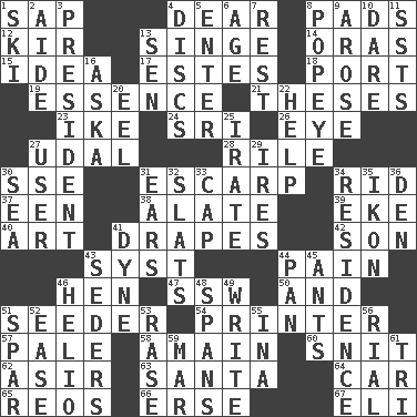 ACROSS 1. Plant excrement 4. Letter starter 8. Writing tablets 12. Apertif with cassis 13. Burn superficially 14. Mouths or openings 15. The content of cognition 17. _____ Park, CO 18. Left side of a ship or aircraft 19. Substance 21. College papers 23. Mamie's husband 24. _ Lanka 26. Sight organ 27. Freehold land 28. Cause heat under the collar 30. Compass dir. 31. Fortification 34. To free from 37. Car or cant ending 38. Having winglike extensions 39. Supplement with great effort 40. Nonscientific branch of learning 41. Window treatments 42. Manchild 43. System (abbr.) 44. Ache 46. Layer 47. Compass dir. 50. Added to 51. Sowing specialist 54. Hard copy producer 57. Light colored 58. With great haste 60. In a ____ (agitated or irritated) 62. SW Saudi Arabia district 63. Before Barbara or Clara 64. 4-wheeled motor vehicle 65. Vintage cars 66. Celtic language 67. Connecticut Ivy Leaguer DOWN 1. What Jean-Claude Killy likes to do 2. Helper 3. Elected leader of a country 4. Plates 5. Keyboard key 6. Grow older 7. Respite 8. Wimpy's pal 9. Came up 10. Have the gumption 11. Fast planes 13. Elected rep. 16. "____ silly question..." 20. Snakelike fish 22. Assist 25. Feeling or showing extreme anger 27. One who makes use of a thing 29. Angers 30. Ocean 31. Hearing organs 32. Narrow boards 33. Head covering 34. Dwelling 35. Visual representation of an object 36. Lair 41. Centimeter-gram-second unit of force 43. Spring feasts 44. Baking dish 45. Pismires 46. Sun: prefix 48. Connects, as a bridge 49. Compose 51. Practice fight 52. Relaxation 53. Raze (variant) 55. _ tizzy (2 wds.) 56. Monetary unit of Yemen 59. Spoil 61. Three (prefix)