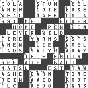 ACROSS 1. Root beer relative 5. Make senseless or dizzy 9. Snakelike fish 12. Afresh 13. ____ d'Azur (French Riviera) 14. Celtic language 15. Welt 16. Double curve, resembling the letter S 17. Globular water bottle used in Asia 18. Fast jet (abbr.) 19. Was introduced to 21. A person who is older than you are 22. Residence 24. Writing instrument 26. Car or cant ending 27. Crowbar 28. Uncontrolled 29. Become fatigued 30. Tall tales 32. Fast planes 36. So be it 37. Falsehood 38. Christmas carol 39. Bits 40. Man with strong sexual desires 42. Like ___ of sunshine 43. Wig 44. Gives off 46. Observe 49. Had dinner 50. Indonesian resort city 51. Taiwanese island in East China Sea 53. Eastern Standard Time (abbr.) 54. The 23rd letter of the Hebrew alphabet 57. American tennis player Robert 58. Merit 61. Prong on a fork 62. It's straight from the horse's mouth 63. Enthusiastic 64. Carrot, for example 65. Affectionate concern, for short 66. Make new 67. Restaurants DOWN 1. Crow sounds 2. Singles 3. Tough but pliablecoriaceous 4. Leather borer 5. Highlander 6. Coat; cloak 7. Shoshoni 8. Born 9. Wear away 10. First name in cosmetics 11. Memorize 14. Pipe bend 19. Madame (abbr.) 20. Suggestive of the supernatural 21. Conclude 23. Baking chambers 24. Abounding in pines 25. Raised railways 27. Pale green bean 28. Compose 29. Make lace 31. Having winglike extensions 32. Slow-paced one 33. Casting lots 34. Beverages made from leaves 35. Cunning 40. Arrange properly for use 41. Confederate soldiers (slang) 43. The 19th letter of the Greek alphabet 45. Floor protector 46. Don Adams' spy role 47. Artist's stand 48. Moral principle 52. Elected rep. 53. Inside; within (prefix) 55. At once, immediately (arch.) 56. Moistens 58. Hearing organ 59. "___ Maria" 60. To free from 61. Three (prefix)