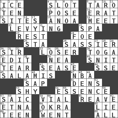 ACROSS 1. Frozen water 4. Narrow opening 8. Edible starchy tuberous root 12. Nine, plus one 13. Introduce or present, as a question 14. Part of Q.E.F. 15. Settings 18. Small Philippine buffalo 19. Rendezvous 20. Imposing or collecting, as a tax 22. Health resort 23. Relief 24. Enemy 25. R.R. building 26. More disrespectful 30. Title for a knight 33. Failure 36. Ancient Roman robe 37. Prepare for publication 39. Teachers' org. 40. In a ____ (agitated or irritated) 41. Lacerate 42. Gospel singer Marvin 44. Compass dir. 45. Deli grouping 47. Basketball assoc. 50. Plant excrement 51. Habitations of wild animals 53. Like a shrinking violet 54. Gist 57. Ketch in the Levant 59. Small bottle 61. Break or tear apart 63. Inactive volcano in Sicily 64. Gumbo ingredient 65. Whopper 66. Adolescent 67. Gone 68. 100% DOWN 1. It is 2. To provide with a ceiling 3. Keyboard key 4. Connect, as a bridge 5. Protracted 6. Bear (Spanish) 7. Afternoon social gathering 8. Storms 9. Type of rug 10. Actress Charlotte 11. Baseball player Mel 16. Nights before holidays 17. System (abbr.) 21. Slanted text style (abbr.) 22. Distress signal 24. Distant 26. Oceans 27. Charged particles 28. Armor plate that protects the chest 29. Pace 30. Puts into a specified state 31. The main thing one is thinking about 32. Monetary unit of Yemen 34. Washington bills 35. Ocean 38. File 13 42. Small drink 43. Extremities 46. Can I? 48. Fermented drink made from hops 49. Queen of England 1702-14 52. Any of the three canals of the cochlea 53. Trig term 54. Merit 55. Narrow board 56. Morally bad or wrong 57. Arrange properly for use 58. Had dinner 59. Promise 60. Mamie's husband 62. Snakelike fish