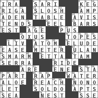 ACROSS 1. Lyricist Gershwin 4. Indian skirt 8. Cask 11. Capital of Latvia 13. Agitate, as a liquid 15. Electrical Unit 16. Arabian gulf 17. Eating place 18. Opinion 19. Looks after 21. Snakelike fish 22. Long, evenly shaped pieces 23. Eastern Standard Time (abbr.) 24. Grow older 27. Festering 29. The longest river in Central Asia 30. Drinks excessively 34. 54 in ancient Rome 36. Tiny particle 39. Evade 40. Comfort 41. Distance measurement 43. ____ Bator 44. Excessive but superficial compliments 46. Singer James 47. Scottish cap 48. Father Junipero _ 49. Travel on or in a vehicle 51. "We ___ not amused" (Victoria) 53. Compass dir. 54. R.R. building 57. Role in a play 60. Strike 63. Wetness 65. _ vera 66. Arrive at 69. Words to Nanette 70. Allow 71. Twentieth part of a lira 72. Flats, for short 73. Ocean 74. Egg locale 75. Compass dir. DOWN 1. Feeling or showing extreme anger 2. Amusement-park features 3. Rep 4. Fast jet (abbr.) 5. In the manner of 6. Loose flowing garment 7. Capri or Wight 8. Polynesian shrub of the pepper family 9. Arab leader 10. Global Positioning Systems (abbr.) 12. Added to 14. Aid 18. Utter; complete 20. Saxophone 25. Island territory of the United States 26. First name in cosmetics 28. Shoshoni 29. Make much ado about nothing 31. Monetary unit of Botswana 32. Dutch treat 33. Elected rep. 34. Unable to walk 35. Austrian river, tributary to the Danube 37. Baseball player Mel 38. Distance measurement (Brit.) 40. Curvy letter 42. Water falling in drops from the sky 45. Impair 50. Morning condensation 52. Blunders 54. Ceases 55. Portable shelters 56. Came up 57. Friends 58. Toward shelter 59. Roll call or roster of names 61. Period of immesurable duration 62. Diluted with white 64. Santa ___, CA 67. Music discs 68. Being at a high temperature