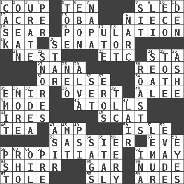ACROSS 1. Overturn; upset 5. Nine, plus one 8. Downhill vehicle 12. 1/640 square mile 13. Chief or king in Benin or Nigeria 14. Sibling's daughter 15. Wither 16. Census information 19. Krazy ___ of comics 20. Elected representative 21. Egg locale 23. And so on (abbr.) 24. R.R. building 27. Grandmother 30. Vintage cars 31. Threatening words 34. Pledge 35. Arab leader 38. Unconcealed 40. Toward shelter 41. Method 42. Ringlike coral islands and reefs 44. Angers 45. Scram, to a cat 46. Afternoon social gathering 47. Electrical Unit 50. Capri or Wight 53. More impudent 57. Night before a holiday 59. Conciliate 63. "If ____ say so..." 64. Bake eggs in their shells 65. Slender fish 66. Unadorned 67. Lacquered or enameled metalware 68. Stealthy 69. Ancient Greek god of war DOWN 1. Keg 2. Sea 3. A salt of uric acid 4. For each 5. Drink excessively 6. Inky black, to poets 7. California wine valley 8. Be seated 9. Luau accessory 10. Environmental prefix 11. Lair 14. Drug cop 17. Shoshoni 18. Car dealer's back yard 20. Play the lead 22. Sounds asleep 24. Lick closed 25. Carryall 26. American tennis player Robert 28. Modern: prefix 29. Inventor's middle name 30. Cooks with dry heat, as in an oven 32. Arrange properly for use 33. Greek god of love 35. Give off 36. Greater amount 37. It may be bright or harebrained 39. Affectionate concern, for short 43. Den 47. SW Saudi Arabia district 48. Floor protector 49. Air pressure measure (abbr.) 51. Arboreal primate 52. Dodge 54. Settles 55. Slanted text style (abbr.) 56. Suggestive of the supernatural 58. Snake ____ (dice throw) 59. Pacific Standard Time (abbr.) 60. 17th letter of the Greek alphabet 61. Lubricate 62. Before (prefix) 63. _ tizzy (2 wds.)