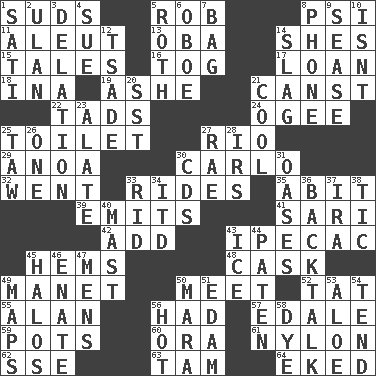 ACROSS 1. Beer foam 5. Director Reiner 8. Air pressure measure (abbr.) 11. Native American of Southwest Alaska 13. Chief or king in Benin or Nigeria 14. "______ My Girl" (Turtles hit) 15. Lies 16. Coat; cloak 17. Grant temporary use of 18. _ tizzy (2 wds.) 19. American tennis player Robert 21. 2nd pers. sing. pres. of can (arch.) 22. Small amounts or degrees 24. Double curve, resembling the letter S 25. Rest room 27. River (Sp.) 29. Small Philippine buffalo 30. Monte _, Las Vegas Hotel/Casino 32. Gone 33. Amusement-park features 35. "This won't hurt ____!" 39. Sends forth 41. Indian skirt 42. Increase 43. Medicinal drug used to evoke vomiting 45. Equivocates 48. Keg 49. French painter Edouard 50. Confront 52. Make lace 55. ____ Jay Lerner 56. Possessed 57. Peak District village in England 59. Cooking vessels 60. Mouth or opening 61. Thermoplastic polyamide 62. Compass dir. 63. Scottish cap 64. Made supply last DOWN 1. Suttee (variant) 2. ____ Bator, Mongolia 3. Conveyance 4. Take to court 5. Writer of Portnoy's Complaint (1969) 6. Mitch Miller's instrument 7. Container for groceries 8. Give a jingle 9. Gospel singer Marvin 10. Is not 12. Sadhe (variant) 14. Volcanic refuse 20. Fast jet (abbr.) 21. Calm and collected 23. Having winglike extensions 25. The 23rd letter of the Hebrew alphabet 26. Single 27. Actress Charlotte 28. Big collection agency 30. Music discs 31. Fertile tracts in a desert 33. To free from 34. It would 36. Sass 37. Retirement account (abbr.) 38. Nervous spasm 40. Vertical spar for supporting sails 43. Frozen water 44. Eucharist need 45. Saint headwear 46. Related on the mother's side 47. Not women's 49. Atlas contents 50. Hindu Mythology: god of death 51. Dutch treat 53. _ vera 54. Be inclined (to) 56. Being at a high temperature 58. Color