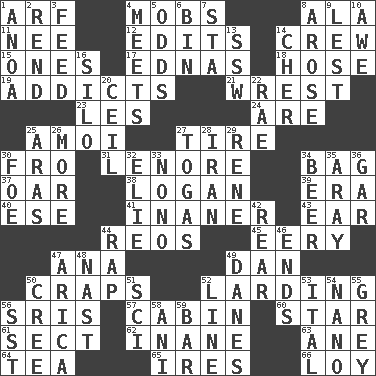 ACROSS 1. Sandy's bark 4. Crowds into 8. Wing 11. Born 12. Proofreads 14. Group working together 15. Singles 17. Ferber et al. 18. Flexible conduit 19. Inveterate users 21. Take or capture by force 23. French article 24. "We ___ not amused" (Victoria) 25. Mine, in Marseilles 27. Become fatigued 30. Away 31. Poe poem 34. Paper or plastic container 37. Rowing implement 38. Utah city north of Ogden 39. Epoch 40. Compass dir. 41. More lacking in sense or substance 43. Hearing organ 44. Vintage cars 45. Suggestive of the supernatural 47. Santa ___, CA 49. Daniel's nick name 50. Dice game 52. Preparing or cooking with lard 56. Indian titles of respect 57. Small house or cottage 60. Play the lead 61. Religious group 62. Empty; void 63. A saturated hydrocarbon 64. Afternoon social gathering 65. Angers 66. Myrna of the movies DOWN 1. Small Philippine buffalo 2. Tear apart 3. Nourish 4. Confronts 5. Likelihood 6. Storage container 7. R.R. building 8. Came up 9. For fear that 10. Deep reverence 13. Compass dir. 14. "Mermaids" star 16. Grain storage tower 20. To provide with a ceiling 22. Actress Charlotte 25. Ancient river in northeast Turkey 26. Greater amount 27. Ancient Roman robes 28. SW Asia republic 29. French philosopher Descartes 30. Enemy 32. Writer Wiesel 33. Words to Nanette 34. Fermented drink made from hops 35. Like ___ of sunshine 36. Slender fish 42. Located in or toward the back 44. Strike 46. Extremities 47. N. Chile seaport 48. Political cartoonist Thomas 49. Natives or inhabitants of Denmark 50. Algonquian 51. _-fi 52. Actor's bit 53. Slanted text style (abbr.) 54. Billionth: prefix 55. Jennifer or Joel 56. Fast jet (abbr.) 58. Cuckoo 59. Oblong piece of solid material
