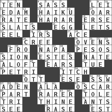 ACROSS 1. "___ Little Indians" 4. Backtalk 8. Luau accessory 11. Dutch treat 13. Japanese poetic form 15. Boat paddle 16. Assign a rank or rating to 17. Ethiopian city, capital of Harari 18. Celtic language 19. Narrow boards 21. Ovum 22. Allows 23. Snakelike fish 24. Big collection agency 27. Adept person 29. Algonquian 30. Baking chambers 34. From 36. California wine valley 39. Mexican monetary units 40. The Jewish people; Israel 41. _____ Park, CO 43. Nathan's nickname 44. High up in or into the air 46. Hearing organs 47. Third day of the wk. 48. _ dish (used to culture cells) 49. Hankering 51. Baseball player Mel 53. Compass dir. 54. Compass dir. 57. An important port of Yemen 60. In the manner of 63. Motion picture award 65. Piece 66. More uncommon 69. Lacquered or enameled metalware 70. Three (prefix) 71. One or ones belonging to thee 72. Pismires 73. Observe 74. Raze (variant) 75. Eastern Standard Time (abbr.) DOWN 1. Laconic 2. Peak District village in England 3. Brizilian seaport 4. Quiet! 5. Auto club (abbr.) 6. Father 7. Heroin 8. Old wives' tales, e.g. 9. Compass direction 10. Angers 12. Was introduced to 14. Capital and largest city of Mongolia 18. Veterans Day date 20. Title for a knight 25. French philosopher Descartes 26. Gospel singer Marvin 28. Police officer (slang) 29. Meet 31. Son of Isaac 32. Make mention of 33. Compass dir. 34. Do some clerical work 35. Carrot, for example 37. Parent Teacher Assoc. 38. Nest on high 40. Plant excrement 42. Fast planes 45. Teat (slang) 50. Corporate head (abbr.) 52. Small pie 54. Biscuitlike quick bread 55. Table seasonings 56. Take or capture by force 57. Tenement units (abbr.) 58. Have the gumption 59. One of the Great Lakes 61. Cowardly lion portrayer 62. Operatic vocal solo 64. R.R. building 67. Followers of ems 68. Portuguese money of account (variant)