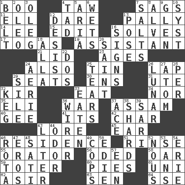ACROSS 1. Sometimes accompanies a hiss 4. The 23rd letter of the Hebrew alphabet 7. Droops 11. Pipe bend 12. Have the gumption 13. Chummy 14. Area sheltered from the wind 15. Prepare for publication 16. Finds the solution 17. Ancient Roman robes 19. Helper 21. Flaplike covering 23. Grows older 24. In addition 25. Metal container 26. Infant locale 29. Theater features 30. Followers of ems 31. Shoshoni 32. Apertif with cassis 33. Consume 34. Not either 35. Connecticut Ivy Leaguer 36. Armed conflict 37. Indian state 40. Unit of force equal to gravity 41. It is 42. Burn to charcoal 43. Old wives' tales, e.g. 45. Ewer handle 46. Dwelling 51. Remove soap 55. Speaker 56. Wrote a lyric poem 58. Boat paddle 59. Carrier 60. Sliced desserts 61. Corn or form start 62. SW Saudi Arabia district 63. Elected rep. 64. Compass dir. DOWN 1. Waist strap 2. Margarine 3. Cassini of fashion 4. Small boy 5. Roberta Peters solo 6. Moistens 7. Table seasonings 8. Inventor's middle name 9. Small, secluded valley 10. System (abbr.) 12. Cease 13. Airs 16. Attaches a signature 18. Silent film actress Nazimova 20. Inhabitant of Heaven 22. Two (Sp.) 24. Nest on high 25. Rends 26. Type of eclipse 27. Tiny particle 28. For each 29. Drop; flow; fall 32. Cask 33. Eroded 36. One who wires 37. Adept person 38. Broken pieces 39. Indian skirt 43. 61 cubic inches 44. Aroma 46. Round or rotation of duties 47. Greek god of love 48. Suttee (variant) 49. 911 reaches them 50. Singer Brickell 52. Horse sense 53. Without 54. 4th largest of the Great Lakes 57. Car or cant ending