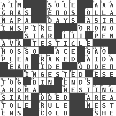 ACROSS 1. Direct toward a target or goal 4. Not divided or shared with others 8. American Automobile Association (abbr.) 11. Pate de foie ____ 13. Greek god of love 14. Rounded earthenware pot or jar 15. California wine valley 16. 24-hour periods 17. SW Saudi Arabia district 18. Stimulate to action 21. U. of Maine site 22. Play the lead 23. Cards in a Roman deck? 25. Animal enclosure 26. Actress Gardner 29. A testis 32. With motion or animation 34. Adept person 35. E Mali city 38. Entreaty 39. Moved through 41. Opera by Verdi 43. Hearing organ 44. Binary compound 45. More peculiar 46. Swallowed 50. Compass dir. 51. Coat; cloak 54. Storage container 55. Conclusions 57. Odor 59. Nestling 63. Thailand, formerly 64. Wrote a lyric poem 67. Type of rug 68. Lacquered or enameled metalware 69. General guideline 70. A home for chicks 71. Followers of ems 72. Having a low temperature 73. A female animal or person DOWN 1. Hindu god of fire 2. SW Asia republic 3. Atlas contents 4. Spring feasts 5. Mouth or opening 6. Myrna of the movies 7. Curvy letter 8. Columnist Joseph or Stewart 9. Place in a line 10. Composer Copland 12. Plant excrements 14. Boat paddle 19. "Tell ____ the Marines!" 20. Actress Charlotte 21. Lubricate 23. Louse (plural) 24. On the rocks 26. Electrical Unit 27. Grand slam 28. Toward the sea 30. Receives possession of 31. Mild oath 33. Indian skirt 36. Helper 37. Lyric poems 39. Swiss mountan, "Queen of the Mountains" 40. Arabian gulf 42. "We ___ not amused" (Victoria) 45. Likelihood 47. Basketball assoc. 48. Looked after 49. Compass dir. 51. Clothes sense 52. Greek mythologigal hunter 53. Scores awarded for successful feats 56. Comedian Laurel of Laurel & Hardy 58. Madame (abbr.) 60. Angers 61. Tender 62. Yard entry 64. The grampus (Milton) 65. Superhero pair 66. Pipe bend