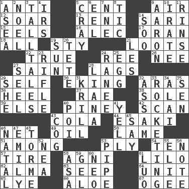 ACROSS 1. Opposed to 5. Penny 9. Wind 12. Fly high 13. Painter Guido (1575-1642) 14. Indian skirt 15. Snakelike fish 16. Actor Baldwin 17. NW Algerian seaport 18. Everything 19. Filthy place 21. Plunders 22. Loyal 24. To separate or throw off 26. Born 27. Virtuous person 28. Falls behind 29. Automatic 30. Supplementing with great effort 32. Caspian sea tributary 36. Person who is morally reprehensible 37. Actress Charlotte 38. Not divided or shared with others 39. Otherwise 40. Abounding in pines 42. Examine minutely or intensely 43. Root beer relative 44. 1973 Nobel Price Winner (Physics) Leo 46. Fish or hair follower 49. Petroleum 50. Unable to walk 51. Amid 53. Travel a route regularly 54. Nine, plus one 57. Hoop that covers a wheel 58. Hindu god of fire 61. _ and Stitch 62. _ mater 63. Ooze 64. A single undivided whole 65. Potassium hydroxide 66. Medicinal plant 67. Double curve, resembling the letter S DOWN 1. Toward the sea 2. Christmas carol 3. Baron Munchausen's specialties 4. Big collection agency 5. Supercomputer manufacturer 6. Snakelike fish 7. Compass dir. 8. Nervous spasm 9. Composer Copland 10. Feeling or showing extreme anger 11. Wash lightly 14. "Barney Miller" actor Jack 19. Player for Phoenix 20. False hair 21. French article 23. Firearm 24. Indian princess (variant) 25. Oval reproductive body of a fowl 27. Stitch closed the eyes of (a falcon) 28. Woody, climbing, usually tropical plant 29. A female animal or person 31. Shrimp-like planktonic crustaceans 32. Indian state 33. Shooting up abruptly 34. Jai ____ 35. Elected rep. 40. Luau course 41. Shout 43. Gear tooth 45. Declare 46. Relating to or accompanying birth 47. Poet Dickinson 48. Singer Mel 52. Teachers' org. 53. Corncob 55. Writer Wiesel 56. Musical sound 58. White ___ sheet 59. Set 60. Modern: prefix 61. Nilotic language
