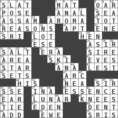ACROSS 1. Narrow board 5. Floor covering 8. Rowing implement 11. Airs 12. Of or related to the anus 14. Ocean 15. Indian state 17. Odor 18. Small child 19. Thinks logically 21. Fitting 22. Compass dir. 23. _ Lanka 24. Car dealer's back yard 25. Layer 27. Compass dir. 28. SW Saudi Arabia district 31. Table seasoning 35. Epoch 37. Beget 38. Length times width 39. What Jean-Claude Killy likes to do 41. Nights before holidays 42. Play the lead 43. Santa ___, CA 45. For fear that 46. Puts into a specified state 47. Curve 49. Part of HMS, perhaps 51. Teachers' org. 52. Title for a knight 55. Compass dir. 57. _ tizzy (2 wds.) 60. Center 62. Ewer handle 63. Type of eclipse 65. Leg joints 66. Neckwear 67. Genesis locale 68. Incision 69. Find the sum of 70. She-sheep 71. Indian titles of respect DOWN 1. Practice fights 2. Failure 3. Slender Brazilian palm 4. Afternoon social gatherings 5. Impair 6. Small Philippine buffalo 7. Pack (down) 8. Clearly or manifestly demonstrative 9. A really long time 10. Pace 13. Thin strip of wood or metal 16. Undercover agent 17. Michaelmas daisies 20. Olfactory organ 26. Artist's stand 29. Angers 30. Repose 31. Backtalk 32. Johnson of "Laugh-In" 33. Resembling or made to resemble leather 34. Tarsus (plural) 36. Alias (abbr.) 40. More lacking in sense or substance 44. Ancient Greek god of war 48. Keg 50. Filth; sediment 52. Contemptuous expression 53. Ancient Celtic tribe of eastern Britain 54. Musical pauses 55. Bristle 56. Expressed in words 58. Naked 59. Afresh 61. Extremities 64. A saturated hydrocarbon