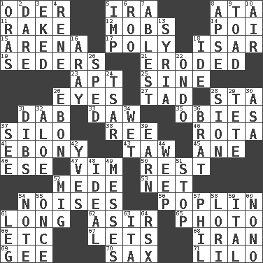 ACROSS 1. Baltic tributary 5. Retirement account (abbr.) 8. _ moment's notice (2 wds.) 11. Immoral or dissolute person 12. Disorderly crowds 14. Luau course 15. Sports stadium 17. More than one (prefix) 18. Austrian river, tributary to the Danube 19. Spring feasts 21. Worn away 23. Fitting 25. Trig term 26. Sight organs 27. Bit 28. R.R. building 31. Small moist lump or mass 33. Obsolete 35. Off-Broadway awards 37. Grain storage tower 38. To separate or throw off 40. Roll call or roster of names 41. Black 43. The 23rd letter of the Hebrew alphabet 45. One (Scot) 46. Compass dir. 47. Zeal 50. Remainder 52. Ancient Persian 53. Fish or hair follower 54. Annoying sounds 56. Cotton for raincoats, e.g. 61. Yearn 62. SW Saudi Arabia district 65. Picture 66. And so on (abbr.) 67. Allows 68. SW Asia republic 69. Turn to the right 70. Saxophone 71. _ and Stitch DOWN 1. Mouths or openings 2. Have the gumption 3. Supplemented with great effort 4. French philosopher Descartes 5. Mischievous child 6. Friend of Pooh 7. Most capable 8. Domed church section 9. Frog relative 10. Wind 13. Damascus' land 16. Like ___ of sunshine 18. Binary compound 20. Moved rapidly 22. Southwest Nigerian state 24. Russian ruler of old 26. Inky black, to poets 28. The Jewish people; Israel 29. Wig 30. White ___ sheet 31. Claim 32. _ vera 34. Dripping 36. Naughty child 37. Perceive with the eye 39. Merit 42. Jacques Cousteau's middle name 44. Shed a tear 48. Standard of perfection 49. Makes clutter 51. Discontinue 52. Russian fighter aircraft 54. Brief written record 55. At one time in the past 57. Silvers or Donahue 58. Australian parrot (variant) 59. Slanted text style (abbr.) 60. Words to Nanette 61. Part of a journey 63. Call ___ day 64. Acura sports coupe
