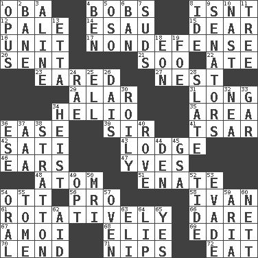 ACROSS 1. Chief or king in Benin or Nigeria 4. Moves up and down 8. Is not 12. Diluted with white 14. He sold his birthright 15. Letter starter 16. A single undivided whole 17. Unrelated to defense, as in spending 20. Posted 21. "Barney Miller" actor Jack 22. Had dinner 23. Having ears or earlike features 27. Egg locale 29. Having or resembling wings 31. Having great length 34. Sun: prefix 35. Length times width 36. Comfort 39. Title for a knight 41. Russian ruler of old 42. Suttee (variant) 43. Cabin 46. Hearing organs 47. Jacques Cousteau's middle name 48. Tiny particle 51. Maternal 54. Baseball player Mel 56. Adept person 58. _ the terrible 61. Rotating or pertaining to rotation 66. Have the gumption 67. Mine, in Marseilles 68. Writer Wiesel 69. Prepare for publication 70. Grant temporary use of 71. Pinches, bites 72. Ingest DOWN 1. Musical composition 2. Object of repulsion 3. Place in a line 4. Benjamin's nick name 5. Bear (Spanish) 6. Bar 7. Soap bubbles 8. Binary compound 9. Elected representatives 10. Political cartoonist Thomas 11. Family _ (genealogy) 13. Singer James 18. A really long time 19. Enemy 24. Actress Charlotte 25. Pipe bend 26. Raised platform 28. Chalkboard 30. Turbulent 32. Teachers' org. 33. Slender fish 34. Robbery 36. Compass dir. 37. Auto club (abbr.) 38. Ski resort town in Vermont 40. Be footloose 44. Lair 45. Girls' org. (abbr.) 49. Choose 50. Medical imaging device (abbr.) 52. Periodic rise and fall of the sea level 53. Dodge 54. Of the mouth 55. Heavy book 57. Baking chamber 59. Roberta Peters solo 60. Remaining after all deductions 62. Help 63. Biblical high priest 64. Mouth edge 65. It is so