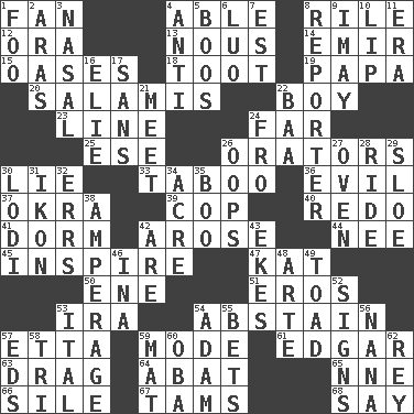 ACROSS 1. Avid follower 4. Competent 8. Cause heat under the collar 12. Mouth or opening 13. Horse sense 14. Independent ruler or chieftain 15. Fertile tracts in a desert 18. A blast of a horn 19. Dad 20. Deli grouping 22. Male child 23. Actor's bit 24. Distant 25. Compass dir. 26. Speakers 30. Falsehood 33. Off limits 36. Morally bad or wrong 37. Gumbo ingredient 39. Police officer (slang) 40. Make new 41. Dormintory (informal) 42. Came up 44. Born 45. Stimulate to action 47. Krazy ___ of comics 50. Compass dir. 51. Greek god of love 53. Lyricist Gershwin 54. Choose not to consume 57. Singer James 59. Method 61. _ Allan Poe 63. To draw with force 64. Blind as ____ 65. Compass dir. 66. Filth; sediment 67. Scottish caps 68. Declare DOWN 1. Egg _ yung 2. Ancient river in northeast Turkey 3. Relating to the nose 4. Against 5. Expressions of contempt or scorn 6. Nilotic language 7. Eastern Standard Time (abbr.) 8. Newsperson 9. "If ____ say so..." 10. Mouth edge 11. Epoch 16. Writer Wiesel 17. Without 21. Rendezvous 22. Sound made by sheep 24. Away 26. I made a mistake 27. Baking chamber 28. Travel on an animal 29. _ gin 30. Farming town in central California 31. Picture 32. Blunders 34. 43,560 square feet 35. Oct. 31 cry 38. Electrical Measurement 42. "We ___ not amused" (Victoria) 43. Supplements with great effort 46. _ tizzy (2 wds.) 48. Johnson of "Laugh-In" 49. Frog relative 52. Public displays of written messages 53. Slanted text style (abbr.) 54. First of billions? 55. Wagers 56. Nanny 57. Begley and Asner 58. Three (prefix) 59. Floor protector 60. Chief or king in Benin or Nigeria 62. Marina Del _, California