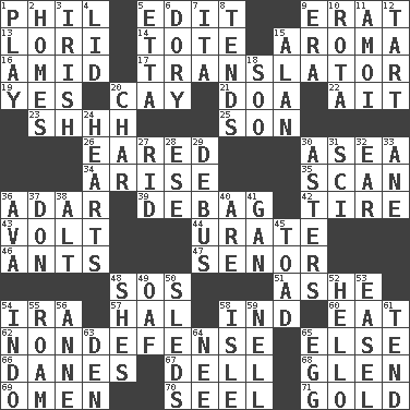 ACROSS 1. Silvers or Donahue 5. Prepare for publication 9. Part of Q.E.F. 13. Australian parrot (variant) 14. Carry 15. Scent 16. Among 17. Interpreter 19. Consenting reply 20. Island 21. ___ good deed 22. Small island 23. Quiet! 25. Male offspring 26. Having ears or earlike features 30. Toward the sea 34. Originate 35. Examine minutely or intensely 36. The sixth month of the Jewish calendar 39. Debunk (Brit. slang) 42. Become fatigued 43. Electrical Unit 44. A salt of uric acid 46. Pismires 47. Sir (Sp.) 48. Mayday 51. American tennis player Robert 54. Lyricist Gershwin 57. Actor Linden 58. Working for oneself (abbr.) 60. Ingest 62. Unrelated to defense, as in spending 65. Otherwise 66. Natives or inhabitants of Denmark 67. Small valley 68. Small, secluded valley 69. Sign of things to come 70. Stitch closed the eyes of (a falcon) 71. Precious metal DOWN 1. Romp 2. Dwellings 3. From or relating to Ireland 4. Hat (slang) 5. Singer James 6. Dinghy 7. Call ___ day 8. Is inclined (to) 9. Period 10. Round or rotation of duties 11. Mine, in Marseilles 12. Small pie 15. Actor Alda or Thicke 18. "Barney Miller" actor Jack 20. Burn to charcoal 24. Centers of feelings and intuitions 27. To free from 28. Compass dir. 29. Alight from a bus 30. Michaelmas daisies 31. _-fi 32. Ewer handle 33. One (Scot) 36. Actress Gardner 37. Spanish title 38. The first octave above the treble staff 40. "We ___ not amused" (Victoria) 41. Separate the seeds from cotton 45. Frog relative 48. "______ My Girl" (Turtles hit) 49. Clumsy lout 50. Bobsleighs 52. Phone greeting 53. Artist's stand 54. _ china 55. Wander 56. Singer Murray 58. Small island 59. 1994 drama film starring Jodie Foster 61. Look after 63. Lair 64. Born 65. Oval reproductive body of a fowl