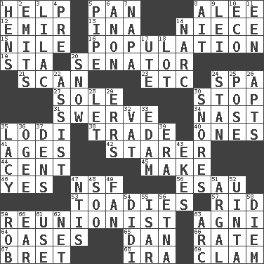 ACROSS 1. Assist 5. Baking dish 8. Toward shelter 12. Independent ruler or chieftain 13. _ tizzy (2 wds.) 14. Sibling's daughter 15. The longest river in the world 16. Census information 19. R.R. building 20. Legislator 21. Examine hastily 23. And so on (abbr.) 24. Health resort 27. Flatfish 30. Discontinue 31. Turn aside suddenly 34. Political cartoonist Thomas 35. Farming town in central California 38. Exchange 40. Singles 41. Eons 42. A viewer who gazes fixedly 44. Penny 45. Cause to be 46. It is so 47. Science/research agcy. 50. He sold his birthright 53. Sycophants 57. To free from 59. One who advocates reunion 63. Hindu god of fire 64. Fertile tracts in a desert 65. One of the 12 tribes of Israel 66. Pace 67. Cy Young winner Saberhagen 68. Lyricist Gershwin 69. Dollar (slang) DOWN 1. Coop moms 2. Sends forth 3. Pale purple color 4. Before (prefix) 5. Corncob 6. Soon (poet.) 7. California wine valley 8. Small island 9. Flowery wreath 10. Environmental prefix 11. Car or cant ending 14. Drug cop 17. Shoshoni 18. Car dealer's back yard 20. Overwhelm 22. Help 24. Comedian Laurel of Laurel & Hardy 25. Airs 26. Tenement units (abbr.) 28. Allow 29. Blunders 30. Sounds asleep 32. Large container 33. Dutch treat 35. Made of lace 36. Double curve, resembling the letter S 37. Lairs 39. Period 43. Makes supply last 47. Nuclear Threat Initiatives 48. "Barney Miller" actor Jack 49. Avid follower 51. Therefore, facetiously 52. National forest in Provo, Utah 54. "You Light Up My Life" star Conn 55. Austrian river, tributary to the Danube 56. Inactive volcano in Sicily 58. South Vietnam president (1954) 59. Director Reiner 60. Ewer handle 61. Purpose 62. Fish or hair follower 63. Curve