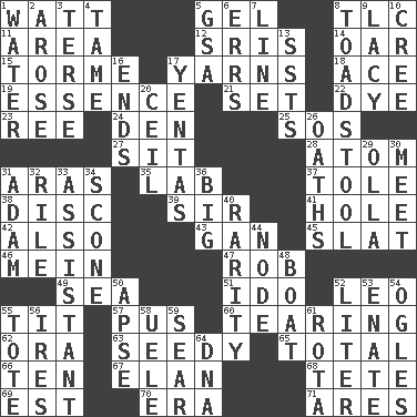 ACROSS 1. Electrical Unit 5. Set 8. Affectionate concern, for short 11. Length times width 12. Indian titles of respect 14. Boat paddle 15. Singer Mel 17. Entertaining tales 18. Adept person 19. Substance 21. Put into a specified state 22. Color 23. To riddle 24. Lair 25. Mayday 27. Be seated 28. Smallest unit of an element 31. Ancient river in northeast Turkey 35. Experiment locale 37. Lacquered or enameled metalware 38. Plate 39. Title for a knight 41. Opening into or through something 42. In addition 43. Separate the seeds from cotton 45. Narrow board 46. Chow _ 47. Director Reiner 49. Ocean 51. Wedding promise 52. Lion 55. Teat (slang) 57. Tenth month of the Hindu calendar 60. Separating forcefully 62. Mouth or opening 63. Full of seeds 65. "_____ Recall" 66. "___ Little Indians" 67. Enthusiasm 68. False hair 69. Eastern Standard Time (abbr.) 70. Epoch 71. Ancient Greek god of war DOWN 1. Wetness 2. Came up 3. Laconic 4. Docile 5. Girls' org. (abbr.) 6. Blunders 7. Actor's bit 8. Inedible or poisonous agaric 9. Made of lace 10. Algonquian 13. Fast planes 16. Conclusions 17. Gossips 20. To provide with a ceiling 26. Curses 29. Water jar 30. Rendezvous 31. First of billions? 32. Cause heat under the collar 33. Helper 34. Biscuitlike quick bread 36. Of large size 40. Noteworthy scarcity 44. Thickened enlargement 48. Water vessel 50. Domed church section 52. 61 cubic inches 53. Maternal 54. Stares at amorously 55. Haul 56. Angers 58. Ubangi River tributary 59. Wither 61. Round or rotation of duties 64. Heredity factor (abbr.)