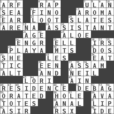 ACROSS 1. Sandy's bark 4. Hit sharply and swiftly 7. ____ Bator 11. Ocean 12. A pale, very dry sherry 13. Odor 14. Ewer handle 15. Spoils 16. Chalkboards 17. Sports stadium 19. Aide 21. Ripen 23. Medicinal plant 24. Engineer (abbr.) 25. Pipe bend 26. Big collection agency 29. Beach, in Buenos Aires 30. Mountains (abbr.) 31. Two (Sp.) 32. A female animal or person 33. French article 34. Erode 35. Nervous spasm 36. Car or cant ending 37. Indian state 40. The first octave above the treble staff 41. Added to 42. Famous astronaut Armstrong 43. Australian parrot (variant) 45. The 18th letter of the Arabic alphabet 46. Dwelling 51. Debunk (Brit. slang) 55. Spoke pompously 56. Opening into or through something 58. Actress Gardner 59. Lugs 60. Of or related to the anus 61. Mouth edge 62. SW Saudi Arabia district 63. Acura sports coupe 64. Binary compound DOWN 1. Toward the sea 2. Hitchcock's "____ Window" 3. Conductor's collection 4. _ de Janeiro 5. Small Philippine buffalo 6. Plant holders 7. A salt of uric acid 8. Globular water bottle used in Asia 9. So be it 10. Political cartoonist Thomas 12. Insipid 13. In addition 16. Beverly of Met fame 18. Nanny 20. Table seasonings 22. Period 24. Choose 25. Make improvements or corrections to 26. Perfect 27. Wander 28. Fast jet (abbr.) 29. Silvers or Donahue 32. R.R. building 33. Soviet premier 1918-24 36. Having ears or earlike features 37. Santa ___, CA 38. A glass for beer 39. Trig term 43. 61 cubic inches 44. Lyric poems 46. Roll call or roster of names 47. Greek god of love 48. Suttee (variant) 49. Burn to charcoal 50. Immeasurably long periods of time 52. Indonesian resort city 53. Enthusiastic 54. Stare wonderingly 57. Not strict