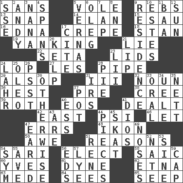 ACROSS 1. Without 5. Grand slam 9. Confederate soldiers (slang) 13. Fastener 14. Liveliness 15. He sold his birthright 16. Pulitzer Prize-winning author Ferber 17. Streamer paper 18. Comedian Laurel of Laurel & Hardy 19. Pulling suddenly and vigorously 21. Untruth 22. Bristle 23. Hats (slang) 24. Trim (branches) 27. French article 28. Corncob 29. Columnist Joseph or Stewart 31. One more than two 32. Part of speech 36. Behest 37. Before (prefix) 38. Algonquian 39. Writer of Portnoy's Complaint (1969) 40. Greek goddess of the dawn 41. Started a card game 42. 90 degrees 44. Air pressure measure (abbr.) 46. Allow 47. Blunders 48. Image 50. Deep reverence 51. Thinks logically 54. Indian skirt 56. Choose 58. Ketch in the Levant 60. Jacques Cousteau's middle name 61. Centimeter-gram-second unit of force 62. Inactive volcano in Sicily 63. Ancient Persian 64. Perceives with the eye 65. Ooze DOWN 1. Compass dir. 2. Actor Griffith 3. Nanny 4. Connects, as a bridge 5. Actresses Bloom and Felton 6. Cassini of fashion 7. Pet locale 8. Compass dir. 9. Dwelling 10. _____ Park, CO 11. Sound made by sheep 12. Player for Phoenix 17. Quote 20. Seaweed 21. Mouth edge 23. Cards in a Roman deck? 24. Cowardly lion portrayer 25. Butter sub 26. Inconspicuous attention getter 28. Sliced dessert 30. Else 31. Big collection agency 33. Taken by mouth 34. Ubangi River tributary 35. Remaining after all deductions 37. Cooking vessel 40. Double-curved letter 41. "Vaya con ____" 43. "We ___ not amused" (Victoria) 44. Components 45. Three-handed card game 47. Having ears or earlike features 49. Olfactory organs 51. French philosopher Descartes 52. Nathan's nickname 53. Trig term 54. Symbol (abbr.) 55. "___ Maria" 56. Begley and Asner 57. Sodium hydroxide 59. Head covering