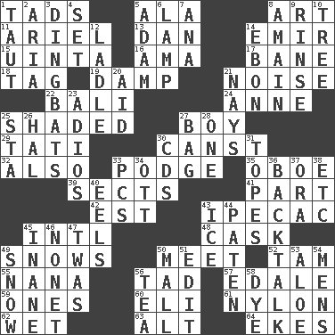 ACROSS 1. Small amounts or degrees 5. Wing 8. Nonscientific branch of learning 11. Satellite of Uranus 13. One of the 12 tribes of Israel 14. Arab leader 15. National forest in Provo, Utah 16. Nanny (var.) 17. Object of repulsion 18. Label 19. Moist 21. Annoying sound 22. Indonesian resort city 24. Queen of England 1702-14 25. Cast a shadow over 27. Male child 29. Jacques of French films 30. 2nd pers. sing. pres. of can (arch.) 32. In addition 33. Porridge 35. Mitch Miller's instrument 39. Religious groups 41. Component 42. Eastern Standard Time (abbr.) 43. Medicinal drug used to evoke vomiting 45. International (abbr.) 48. Keg 49. Frozen precipitation (plural) 50. Rendezvous 52. Scottish cap 55. Grandmother 56. Small amount or degree 57. Peak District village in England 59. Washington bills 60. Connecticut Ivy Leaguer 61. Thermoplastic polyamide 62. Soggy 63. The first octave above the treble staff 64. Makes supply last DOWN 1. Strained 2. Roberta Peters solo 3. Empty-headed or silly people 4. Arrange properly for use 5. First man 6. Desk light 7. Santa ___, CA 8. At full speed 9. Remove soap 10. Family _ (genealogy) 12. Dipping utensil 14. Inky black, to poets 20. Help 21. Negative votes 23. Goodbye (Sp.) 25. R.R. building 26. Actor Linden 27. Paper or plastic container 28. Single 30. Music discs 31. Drinks excessively 33. Personal Computers (abbr.) 34. Baseball player Mel 36. Sass 37. Mouth or opening 38. And so on (abbr.) 40. Snakelike fish 43. Frozen water 44. Eucharist need 45. Lacking in sense or substance 46. Music written for nine 47. It was, poetically 49. Frozen precipitation 50. Shopping center 51. Prepare for publication 53. Medicinal plant 54. Not women's 56. Beverage made from leaves 58. Color