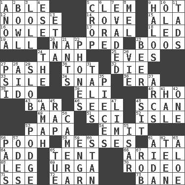 ACROSS 1. Competent 5. To starve (Brit.) 9. Being at a high temperature 12. Trap for birds or small mammals 14. Be footloose 15. Wing 16. A small or young owl 17. Spoken 18. Directed 19. 100% 20. Slept 23. Scornful sounds 24. Hyperbolic tangent 25. Nights before holidays 27. Romantic infatuation 30. Small child 32. Pass on 33. Filth; sediment 34. Fastener 36. Period 38. Wedding promise 39. Connecticut Ivy Leaguer 40. 17th letter of the Greek alphabet 43. Oblong piece of solid material 46. Stitch closed the eyes of (a falcon) 48. Examine hastily 49. Apple computer (short form) 51. _-fi 52. Capri or Wight 53. Dad 54. Send forth 56. "Silly old bear" 58. Makes clutter 61. _ moment's notice (2 wds.) 64. Increase 65. Portable shelter 66. Satellite of Uranus 68. Part of a journey 69. Capital and largest city of Mongolia 70. Cowboy competition 71. Compass dir. 72. Merit 73. Object of repulsion DOWN 1. Small Philippine buffalo 2. Soup holder 3. Hang loosely or laxly 4. Compass dir. 5. Riding implement 6. Old wives' tales, e.g. 7. Dodged 8. Cartoonist voice _ Blanc 9. Auras 10. Butter sub 11. Small boys 13. Inactive volcano in Sicily 21. Pismires 22. Gives a jingle 23. Fermented drink made from hops 24. Definite Article 26. Compete 27. Air pressure measure (abbr.) 28. Assist 29. Oscar Madison type 31. Stories 35. Parts 37. Arches 41. Actor Linden 42. Single 44. Wet nurse 45. Hit sharply and swiftly 47. Welles in "The Third Man" 48. Be seated 50. Device for capturing images 53. Puddle 55. Austrian river, tributary to the Danube 56. Friends 57. Lyric poems 59. Engineer (abbr.) 60. Comedian Laurel of Laurel & Hardy 61. Opera by Verdi 62. Adolescent 63. Medicinal plant 65. Third day of the wk. 67. Director Reiner