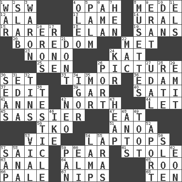 ACROSS 1. Compass dir. 4. Brightly colored fish 8. Ancient Persian 12. Chicken ___ king 13. Unable to walk 14. Mountain range 15. More uncommon 18. Enthusiasm 19. Without 20. Mood resulting from idleness 22. Was introduced to 23. Words to Nanette 24. Krazy ___ of comics 25. Elected rep. 26. Photo 30. Arrange properly for use 33. Southeast Indonesia island 36. Dutch treat 37. Prepare for publication 39. Slender fish 40. Suttee (variant) 41. Queen of England 1702-14 42. 0 degrees 44. Allow 45. More impudent 47. Erode 50. Ring climax 51. Small Philippine buffalo 53. Compete 54. Portable computers 57. Ketch in the Levant 59. Lightbulb-shaped fruit 61. Fur scarf 63. Of or related to the anus 64. _ mater 65. Friend of Pooh 66. Diluted with white 67. Pinches, bites 68. "___ Little Indians" DOWN 1. Armed conflict 2. Broad, flat, thick piece 3. Make _____ (do battle with) 4. Margarine 5. Inside of hand 6. Nanny (var.) 7. Layer 8. French bagpipes 9. Part of Q.E.F. 10. One of the 12 tribes of Israel 11. Raised railways 16. Greek god of love 17. French philosopher Descartes 21. Do not 22. Big _ 24. Apertif with cassis 26. Left side of a ship or aircraft 27. Freehold land 28. Pace 29. Give off 30. Oceans 31. Pulitzer Prize-winning author Ferber 32. Metal containers 34. Russian composer Stravinsky 35. Make imperfect 38. One of the two male reproductive glands 42. Modern: prefix 43. Pile 46. D.D.E's nickname 48. Pismires 49. A blast of a horn 52. To the left, to Queeg 53. Small bottle 54. Desk light 55. Caspian sea tributary 56. A type of plum 57. Plant excrement 58. Santa ___, CA 59. Baking dish 60. Connecticut Ivy Leaguer 62. Age