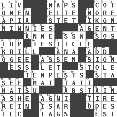 ACROSS 1. 54 in ancient Rome 4. Atlas contents 8. Small bed 11. Presage 13. Writer Wiesel 14. Greater amount 15. Capital of Western Samoa 16. Proofreading order 17. Visual representation of an object 18. Simpletons 21. Representative 22. Singer Murray 23. Compass dir. 25. Mayday 26. Uncastrated adult male sheep 29. A testis 32. Shrimp-like planktonic crustaceans 34. Santa ___, CA 35. Increase 38. Double curve, resembling the letter S 39. NE Netherlands city 41. The Jewish people; Israel 43. Double-curved letter 44. Allow 45. Took without asking 46. Storms 50. R.R. building 51. Perceive with the eye 54. Floor covering 55. Jacques of French films 57. Taiwanese island in East China Sea 59. Refrain by choice 63. American tennis player Robert 64. Hindu god of fire 67. Become fatigued 68. It's straight from the horse's mouth 69. Austrian river, tributary to the Danube 70. Lyric poems 71. Affectionate concern, for short 72. Labels 73. Eastern Standard Time (abbr.) DOWN 1. Grant temporary use of 2. Body of Kaffir warriors 3. Distinctive style or manner 4. Makes clutter 5. Keyboard modifier key 6. Sliced dessert 7. Put into a specified state 8. Popular sodas 9. U. of Maine site 10. Portable shelters 12. Nanny 14. Russian fighter aircraft 19. International (abbr.) 20. Compass dir. 21. Leather borer 23. Trig term 24. Skim 26. Ring climax 27. Goad 28. Sliced desserts 30. Clothes sense 31. 90 degrees 33. For fear that 36. "Vaya con ____" 37. Dunce 39. _ mater 40. Back-to-school mo. 42. Teachers' org. 45. Fast planes 47. Australian flightless bird 48. Flight of steps 49. Keyboard key 51. Don Adams' spy role 52. Artist's stand 53. Value system 56. "Tell ____ the Marines!" 58. Elected rep. 60. Helper 61. Angers 62. A home for chicks 64. Small island 65. Girls' org. (abbr.) 66. Tired old horse