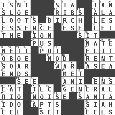 ACROSS 1. Is not 5. R.R. building 8. Scottish cap 11. A type of plum 12. Teases 14. According to 15. Plunders 17. A tree used for making furniture 18. French article 19. Substance 21. Compass dir. 22. Allow 23. Definite Article 24. Electrically charged atom 25. Be seated 27. Ichor 28. Nathan's nickname 31. Remaining after all deductions 35. Cooking vessel 37. Sudden quick movement 38. Mitch Miller's instrument 39. Lower and raise head in agreement 41. Monthly bill 42. Fly high 43. Armed conflict 45. Toward the sea 46. Conclusions 47. Was introduced to 49. Observe 51. Cuckoo 52. Followers of ems 55. Ingest 57. Affectionate concern, for short 60. Commissioned military rank 62. _ de Janeiro 63. Annoying sound 65. Before Barbara or Clara 66. Wedding promise 67. Flats, for short 68. Thailand, formerly 69. Snakelike fish 70. Put into a specified state 71. Snakelike fish DOWN 1. Small island 2. Agitate, as a liquid 3. Trap for birds or small mammals 4. Wig 5. _ Lanka 6. Hoop that covers a wheel 7. Lettered men learn these first 8. Baron Munchausen's specialties 9. Toward shelter 10. Vertical spar for supporting sails 13. "______ My Girl" (Turtles hit) 16. Sever or remove by pinching or nipping 17. Gillaume's butler role 20. Clever action or accomplishment 26. Kind of red light 29. Prong on a fork 30. Singer James 31. Characteristic smell of wine 32. Inky black, to poets 33. Inedible or poisonous agaric 34. Laconic 36. Pull behind 40. Break 44. French philosopher Descartes 48. Airtight sealed metal containers 50. Inactive volcano in Sicily 52. Bert's buddy 53. Relating to or accompanying birth 54. Hits or strikes with great force 55. 4th largest of the Great Lakes 56. Helper 58. Chops off 59. Quote 61. Relaxation 64. Fast jet (abbr.)