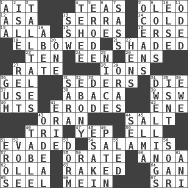 ACROSS 1. Small island 4. Afternoon social gatherings 8. Butter sub 12. White ___ sheet 13. Spanish missionary in California 14. Chilled 15. Silent film actress Nazimova 17. Imelda's hoard 18. Celtic language 19. Turned at an angle; bent 21. Cast a shadow over 23. "___ Little Indians" 24. Car or cant ending 26. Followers of ems 27. Pace 28. Charged particles 30. Set 31. Spring feasts 34. Expire 37. Purpose 38. Phillipine bananalike plant 39. Compass dir. 40. Mountains (abbr.) 41. Eats (away) 42. Compass dir. 43. Northwest Algerian city 44. Table seasoning 46. Three (prefix) 47. Slangy assent 50. Pipe bend 51. Eluded 54. Deli grouping 57. Loose flowing garment 58. Speak pompously 60. Small Philippine buffalo 62. Rounded earthenware pot or jar 63. Swept the length of 64. Separate the seeds from cotton 65. Sew up the eyelids of hawks and falcons 66. Count _ (2 wds.) 67. _ Lanka DOWN 1. Auto club (abbr.) 2. Capri or Wight 3. Baron Munchausen's specialties 4. Giggle 5. Wear away 6. "We ___ not amused" (Victoria) 7. Backtalk 8. Seas 9. Nobles 10. Otherwise 11. Wrote a lyric poem 13. Compass dir. 16. Collude with 20. Single 22. Coop moms 25. Sibling's daughter 27. Respite 29. Mouths or openings 30. Chewing product 31. "Two Mules for Sister ____" 32. Dark wood 33. Male parent 34. Homes 35. Is not 36. She-sheep 41. 4th largest of the Great Lakes 43. Severe or trying experience 44. Ocean 45. _ mater 46. Eating place 48. 1973 Nobel Price Winner (Physics) Leo 49. Eucharist need 51. Greek god of love 52. Short-tailed, large-bodied rat 53. Dormintory (informal) 55. Directed 56. Fly high 59. Actress Charlotte 61. Black tropical American cuckoo