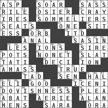 ACROSS 1. Cleo's killer 4. Fly high 8. Backtalk 12. Cause heat under the collar 14. Flexible twig of a willow tree 16. Supercomputer manufacturer 17. Angers 18. Wine waiters 20. Theater features 22. Single 23. Be seated 24. Double-curved letter 25. Globe 28. It would 30. Of or related to the anus 31. Indian antelope 35. French article 37. Charged particles 40. Father 41. Plant holders 42. Music written for nine 44. Narrow board 45. Jacques of French films 46. Tenth: prefix 47. Electrically charged atom 48. Collect or gather 50. Loyal 52. Small amount or degree 54. Elected rep. 55. Actor Linden 58. Connecticut Ivy Leaguer 61. Thick or sticky substance 63. Ancient Celtic tribe of eastern Britain 65. Innocence, gentleness, or tenderness 70. Entreaty 71. Blind as ____ 72. Nest on high 73. Actor Alda or Thicke 74. Not women's 75. "Two Mules for Sister ____" 76. Mouth or opening DOWN 1. Ascend 2. Male parents of animals 3. Entreaties 4. Distress signal 5. Bear (Spanish) 6. Direct toward a target or goal 7. San ____ (Riviera town) 8. _-fi 9. Ancient Greek god of war 10. Indian skirt 11. System (abbr.) 13. Eastern Standard Time (abbr.) 15. Painter Guido (1575-1642) 19. Allows 21. Boy, to dad 26. Water falling in drops from the sky 27. Vital fluid 29. Small ungulate mammals of Africa 30. Aid 32. Grain storage tower 33. SW Asia republic 34. Fish or hair follower 35. Rich soil 36. Singer James 38. Compass dir. 39. Religious groups 41. Parent Teacher Association (abbr.) 43. Become fatigued 49. Settles 51. Single; one (prefix) 53. Capital of the state of Qatar 55. Phone greeting 56. Approach 57. Woody, climbing, usually tropical plant 58. Dutch treat 59. Ear part 60. "Terrible" tsar 62. Washington bills 64. Tax preparer (abbr.) 66. It is 67. Epoch 68. Title for a knight 69. Ocean