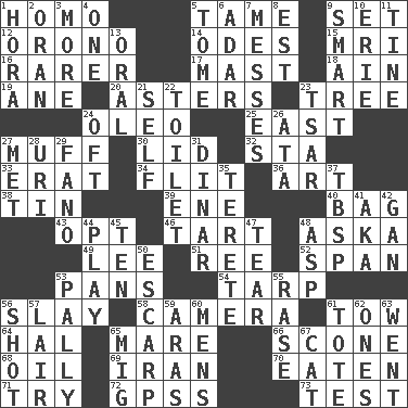 ACROSS 1. Like (prefix) 5. Docile 9. Put into a specified state 12. U. of Maine site 14. Lyric poems 15. Medical imaging device (abbr.) 16. Less widely known 17. Vertical spar for supporting sails 18. The 18th letter of the Arabic alphabet 19. One (Scot) 20. Michaelmas daisies 23. Woody plant 24. Margarine 25. 90 degrees 27. Perform or handle clumsily 30. Flaplike covering 32. R.R. building 33. Part of Q.E.F. 34. Secret move to avoid paying debts 36. Nonscientific branch of learning 38. Shallow baking pan 39. Compass dir. 40. Paper or plastic container 43. Elect 46. Small pie 48. "____ silly question..." 49. Area sheltered from the wind 51. To riddle 52. Connect, as a bridge 53. Baking dishes 54. Canvas cover 56. Kill 58. Device for capturing images 61. Pull behind 64. Actor Linden 65. Female horse 66. Biscuitlike quick bread 68. Lubricate 69. SW Asia republic 70. Eroded 71. Attempt to accomplish something 72. Global Positioning Systems (abbr.) 73. Trial DOWN 1. Israeli folk dance 2. NW Algerian seaport 3. Greater amount 4. Single 5. Heavy book 6. The sixth month of the Jewish calendar 7. Makes clutter 8. Eastern Standard Time (abbr.) 9. Don Adams' spy role 10. One of the Great Lakes 11. Prong on a fork 13. Of the mouth 21. Itself 22. Rest room 23. Russian ruler of old 24. Often (poetically) 26. "One Day ___ Time" 27. Was introduced to 28. RI univ. 29. Papal veil 31. Middle Eastern gold or silver currency 35. Cylindrical with tapered ends 37. Cook's measure (abbr.) 41. Alias (abbr.) 42. Separate the seeds from cotton 44. Shaw product 45. "___ Little Indians" 47. Pull apart 48. Cleo's killer 50. Fortification 53. Friendly 55. To erase 56. Attempt 57. Den 59. Ancient river in northeast Turkey 60. Not women's 61. Haul 62. Singles 63. Left 65. Russian fighter aircraft 67. Feline